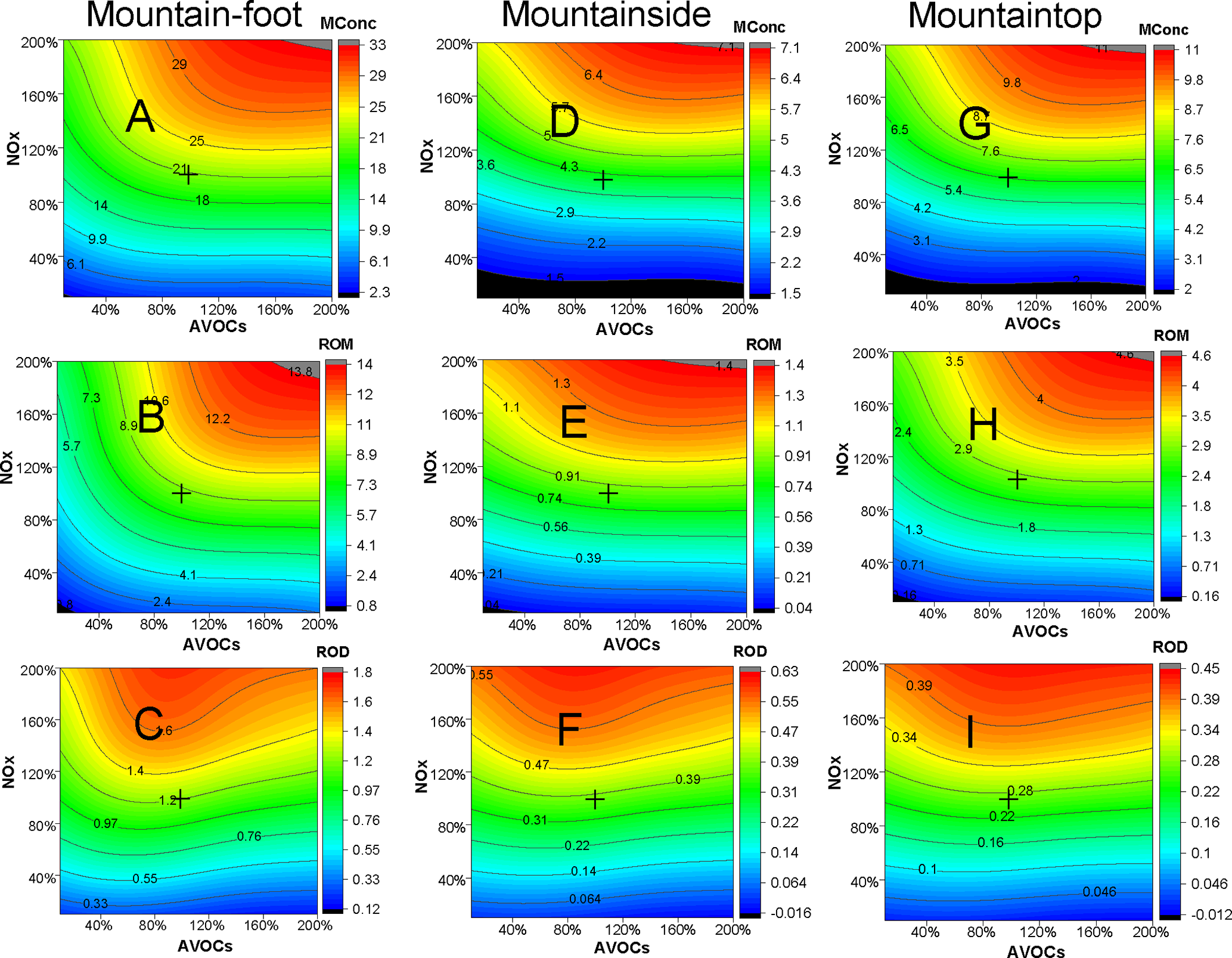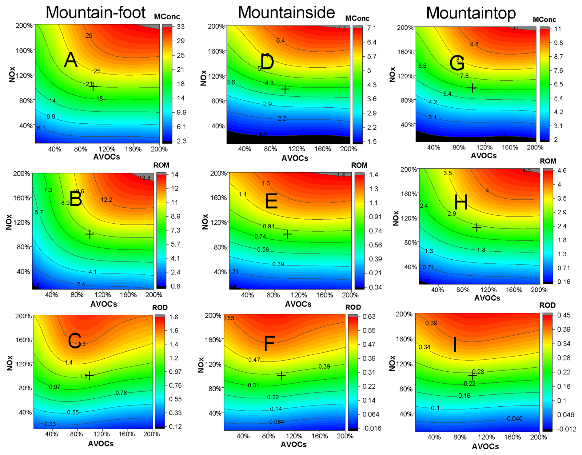 Figure 7The isopleths of the daily maximum hourly O3 concentration (MConc) (units: ppb), daily maximum net O3 production rate (ROM) (units: ppb h−1), and daily average net O3 production rate (ROD) (units: ppb h−1) as a function of the relative changes in anthropogenic VOCs (AVOCs) and NOx across varying elevation sites during the entire observational period. The black cross represents at point 1,1 represents modelled Mconc, ROM and ROD at observed VOC and NOx concentrations.
