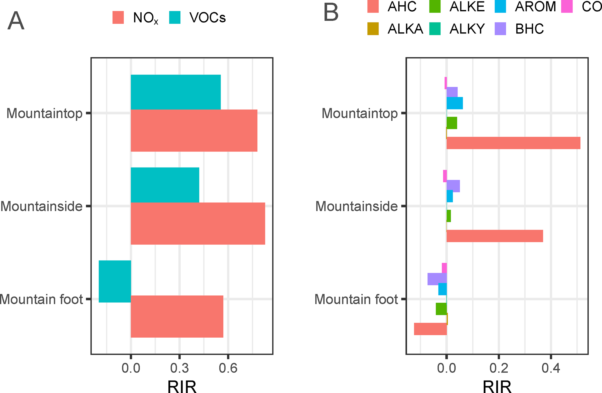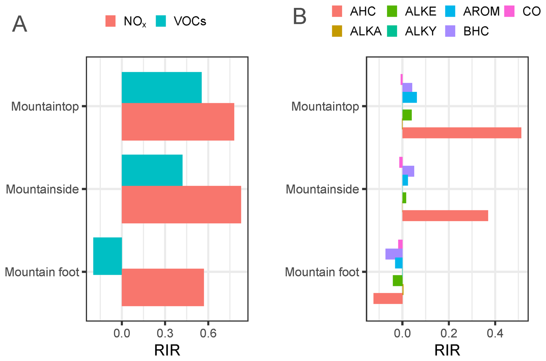 Figure 8Model-calculated relative incremental reactivity (RIR) distributions for (A) major O3 precursor groups and (B) VOCs sub-groups across altitudinal gradients during the observational campaign. Key to abbreviations: AHC, anthropogenic hydrocarbons; ALKA, alkanes; ALKE, alkenes; ALKY, acetylene; AROM, reactive aromatics; BHC, biogenic hydrocarbons.
