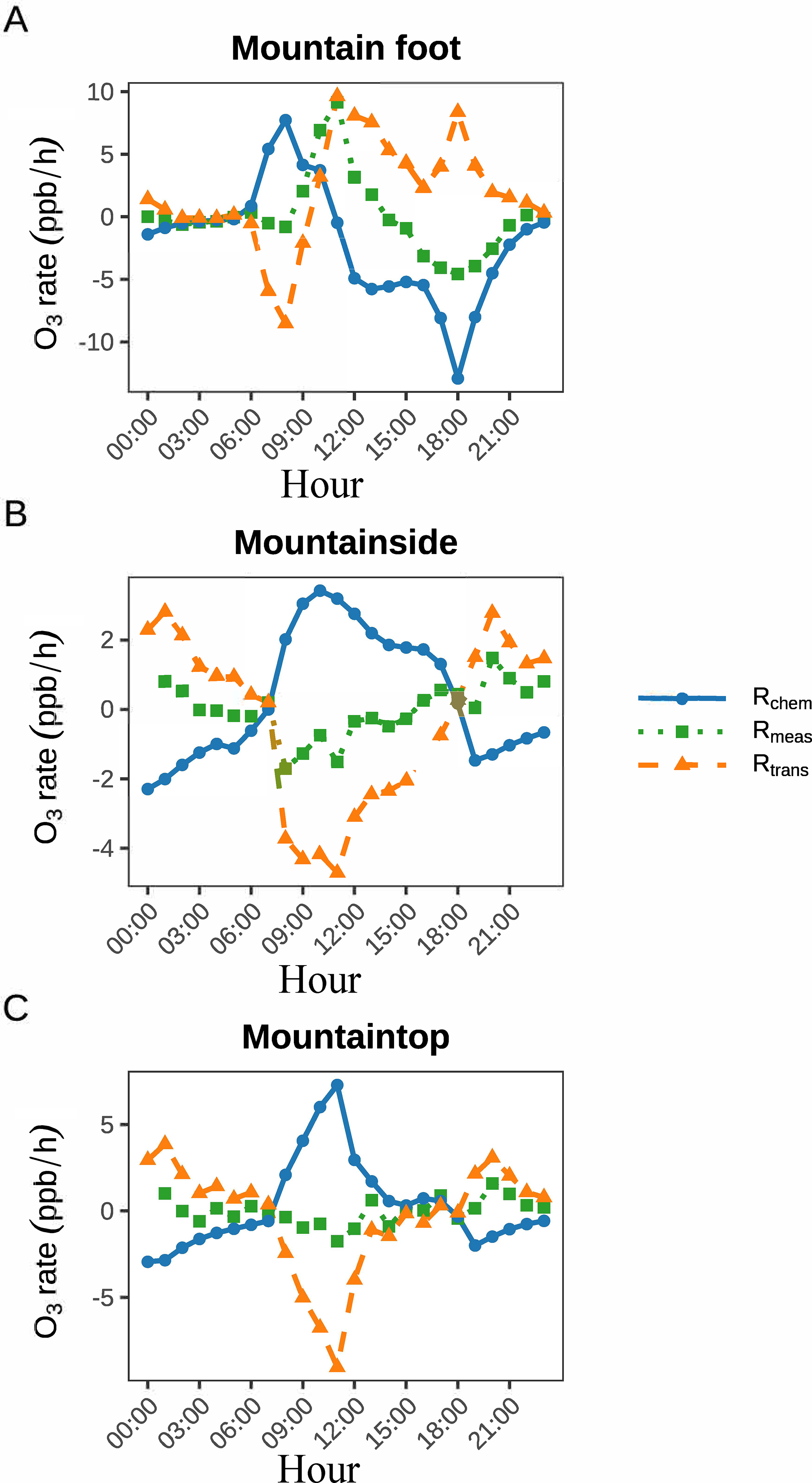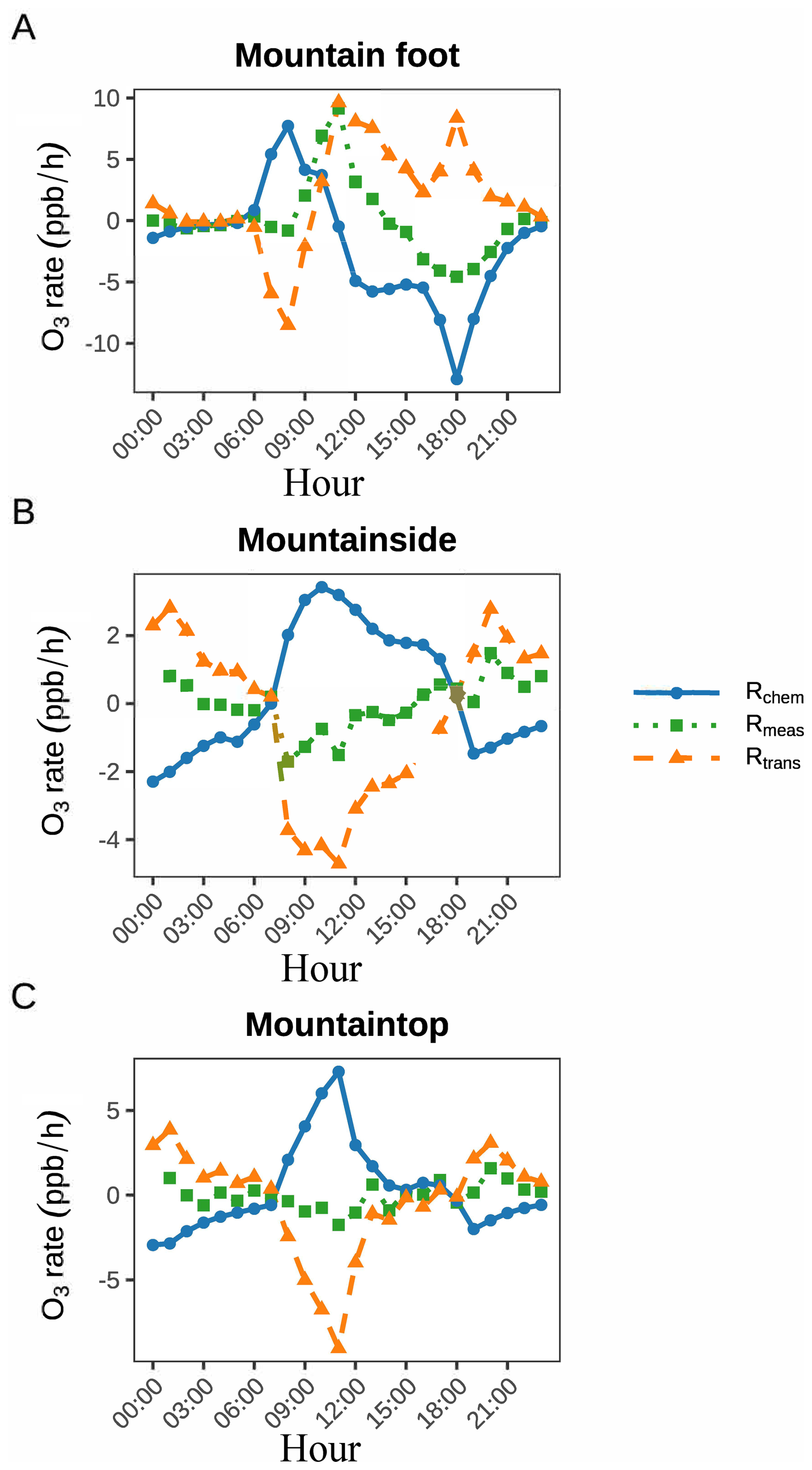 Within this framework, in situ O3 formation and consumption kinetics were explicitly calculated. To avoid confounding effects from NO-driven O3 titration, we analyzed the net formation rate of odd oxygen (O3 + NO2) rather than O3 alone. The relative roles of local photochemistry and physical transport were analytically separated using the relation: , where Rmeas is the observed O3 change rate, Rchem is the chemically driven O3 formation rate derived from the model, and Rtrans represents the net flux due to all non-photochemical processes. These include: (1) horizontal advection of O3 and its precursors, (2) vertical exchange through mountain–valley circulations and entrainment from the free troposphere, (3) dry deposition to surfaces, and (4) any chemical pathways not included in MCM v3.3.1. In mountainous regions, thermally driven slope flows can make vertical transport particularly significant (Henne et al., 2005; Wagner et al., 2014). Positive Rtrans values indicate net O3 import via transport exceeding deposition losses, whereas negative values imply net export or deposition exceeding import. For quantifying O3 production and loss pathways, the model was constrained only by measured precursor concentrations and meteorological parameters; O3 itself was left unconstrained. This allowed the model to independently simulate gross chemical production and destruction rates. The discrepancy between modeled and observed O3 then provided insight into the net effect of physical transport processes (Rtrans). Further details on the computational chemistry methodology are described in prior studies (Zhou et al., 2024; Zhong et al., 2025; Liu et al., 2022; Chen et al., 2020; Xue et al., 2014). Mechanistic analysis indicated that O3 production was dominated by NOx oxidation via peroxy radicals (HO2 + RO2), while major loss pathways included photolytic decomposition and reactions with NO2, OH, HO2, and unsaturated VOCs. Although MCM v3.3.1 is among the most comprehensive chemical mechanisms available, it may not capture all O3-forming routes-particularly those involving unmeasured VOC species or complex oxidation products. Recent studies suggest that MCM may underestimate O3 production by 10 %–20 % in some environments due to omitted chemistry of larger alkanes, sesquiterpenes, and oxygenated VOCs (Wang et al., 2018; Jenkin et al., 2019).