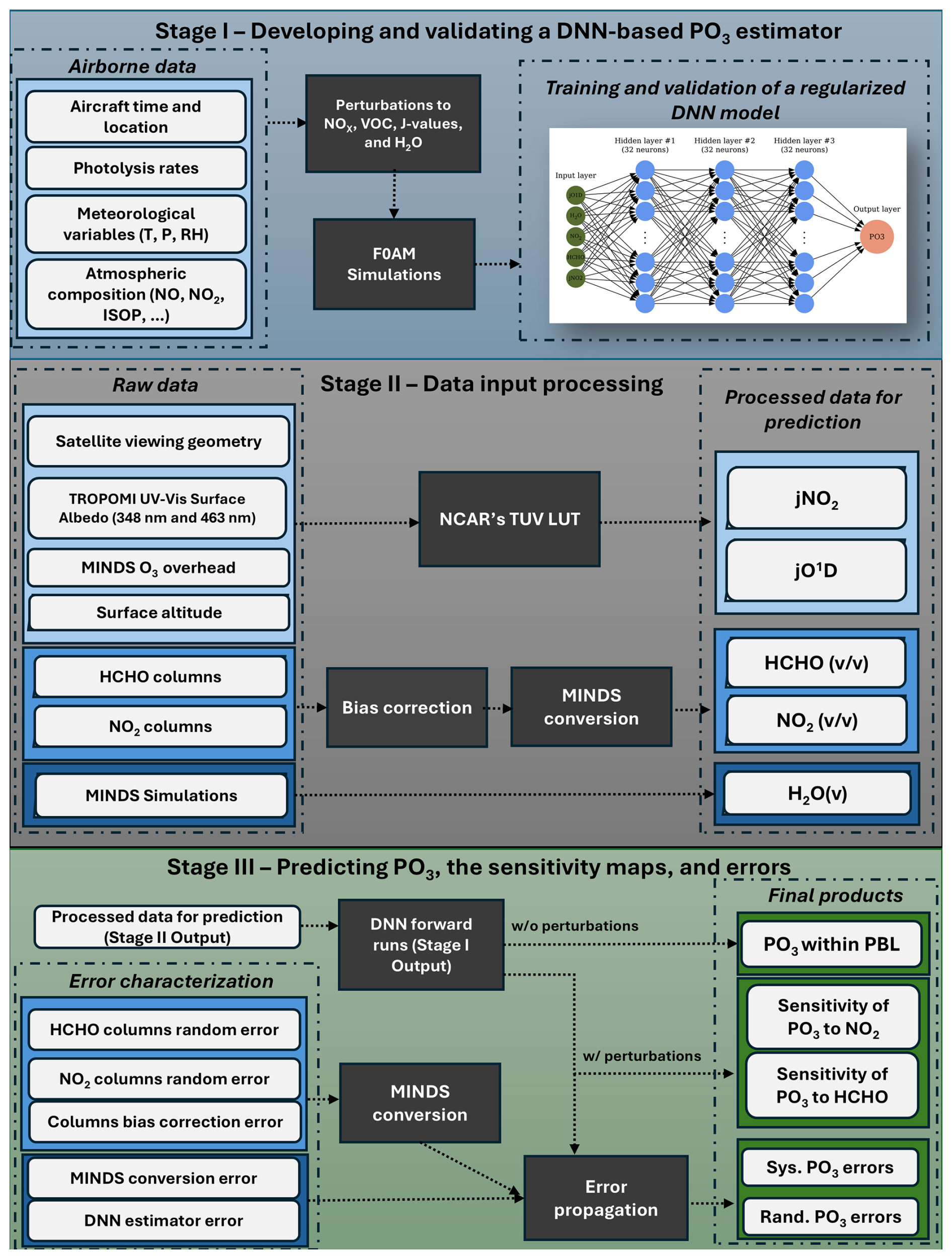 • Stage III. In the final stage, we predict PO3, generate sensitivity maps, and provide both systematic and random errors associated with these estimates. To create PO3 maps, we input the five parameters from Stage II into the DNN model developed in Stage I. To generate the sensitivity maps of PO3 in relation to NO2 and HCHO, we apply perturbations to NO2 and HCHO based on the methodology described in Sect. 3.3. These perturbations also serve another purpose which is to propagate the errors associated with the retrievals of HCHO and NO2, as well as their corresponding conversion factors from MINDS into the final product. A comprehensive explanation of the error budget and characterization can be found in Sect. 3.4.