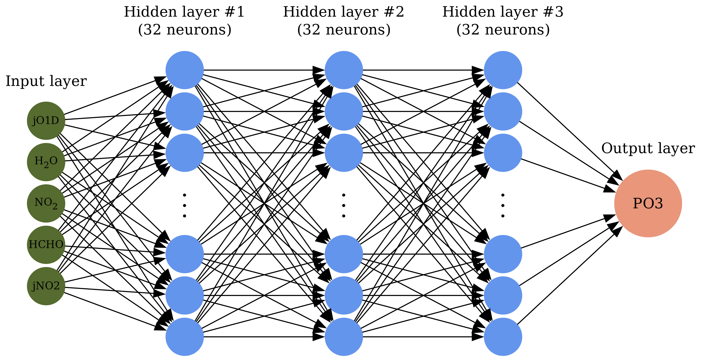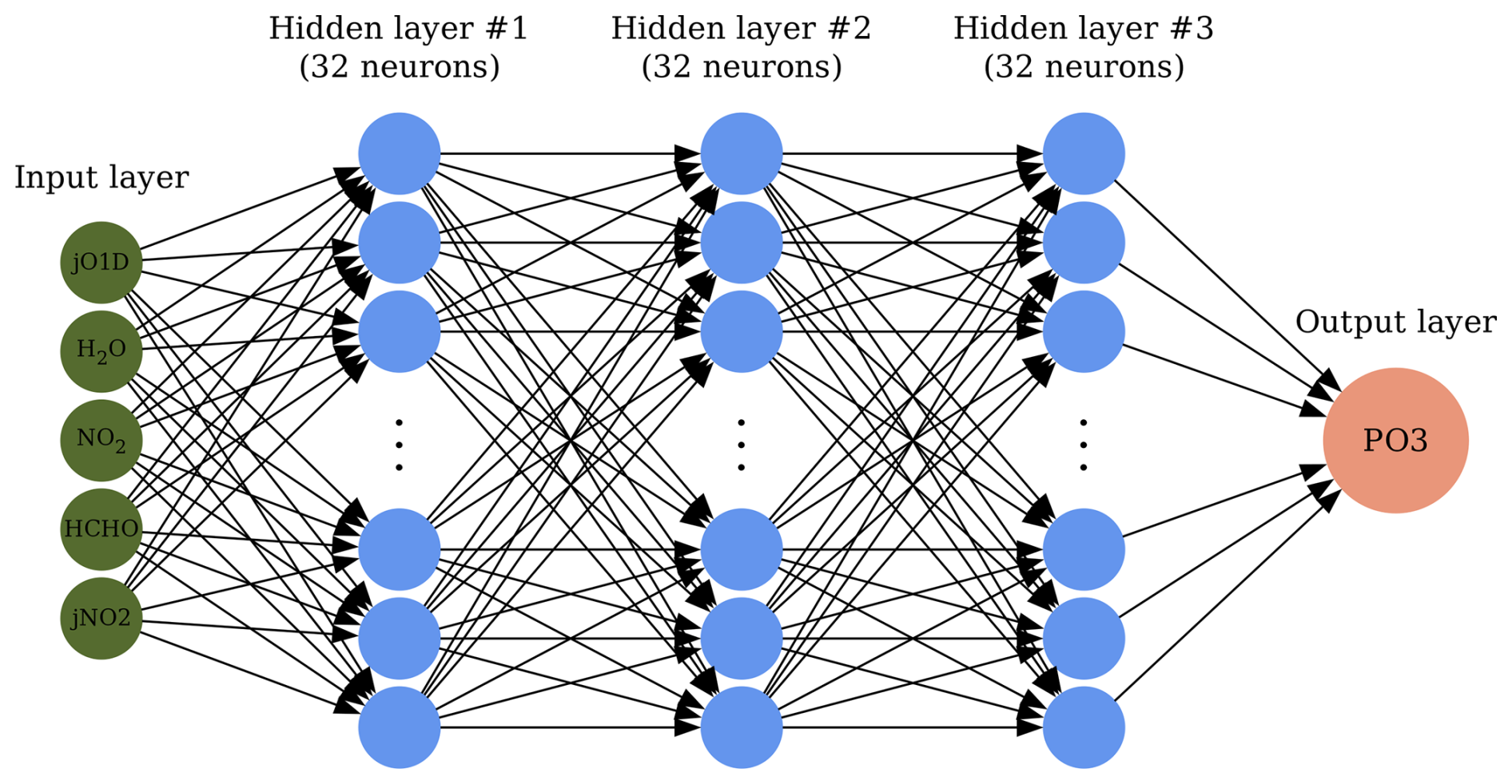 The overall architecture of the DNN model is portrayed in Fig. 2. The design consists of three fully-connected hidden layers each having 32 neurons. The neurons are equipped with rectified linear unit (ReLU) activation functions. The training dataset ( 6.4 millions) is split into 20 % test, 24 % validation, and 56 % training. Training inputs to the parametrization consists of HCHO, NO2, jO1D, jNO2, and H2O(v). Prior to the training, we normalize them, such that each feature (x) is rescaled according to x=x-μσx, where μ and σ represent the mean and standard deviation of the feature, respectively, ensuring a mean of zero and a variance of one. The optimization (training) of the DNN follows the backpropagation rule armed with Adaptive Moment Estimation (ADAM) optimizer which is known to perform well with noisy data (Kingma and Ba, 2017). The initial learning rate is set to 10−5. We use 500 epochs. The loss function (L) of the optimalization problem is: