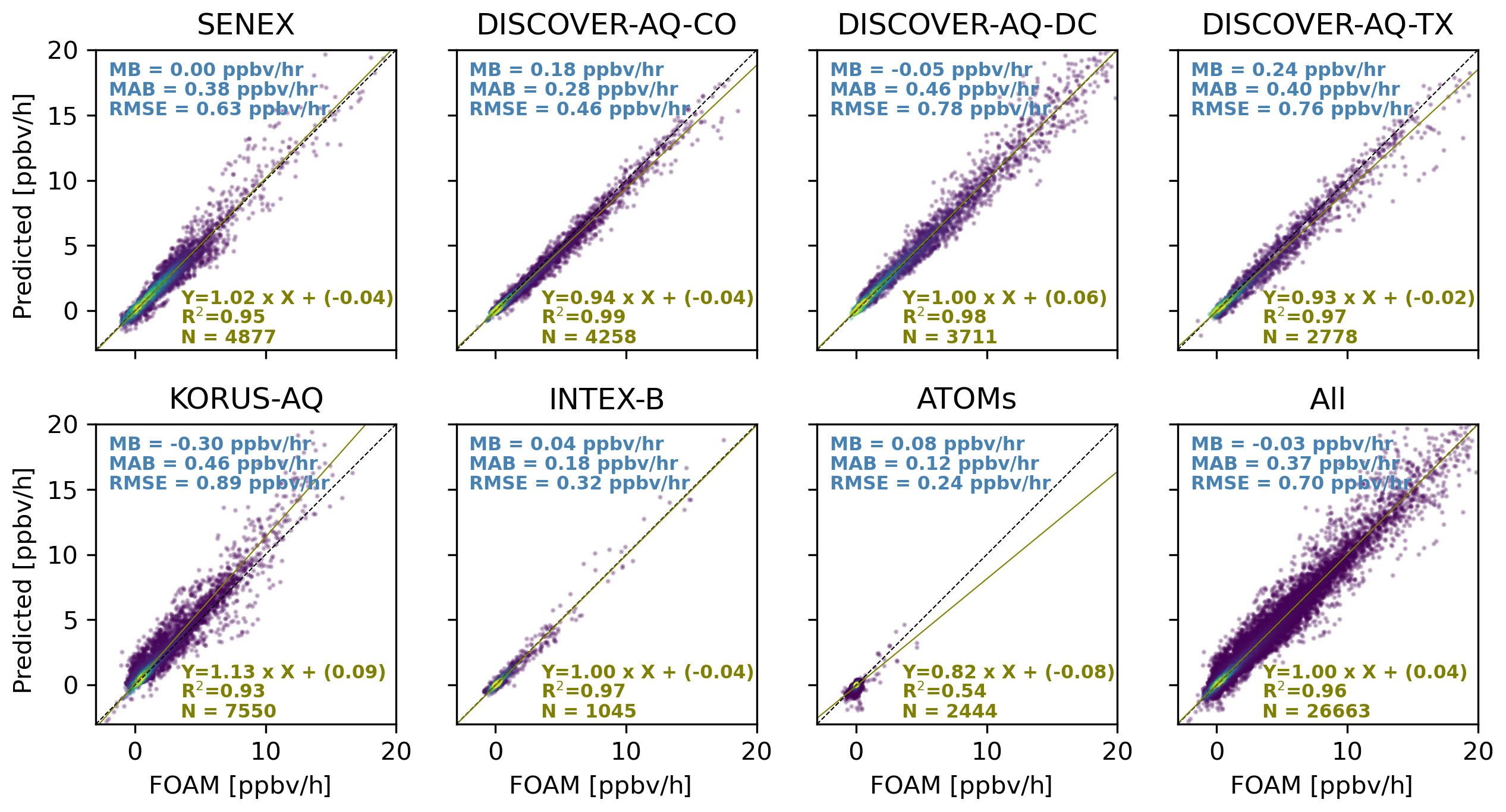 Figure 3Scatterplots comparing observationally-constrained F0AM model PO3 and the predictions that were based on the DNN for the test data from each air quality campaign. The test data have never been used for hyper tuning the algorithm. “All” denotes all test data.