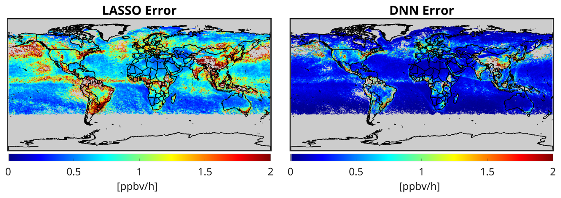 • Higher predictive power. PO3LASSO predicted PO3 for all datapoints collected from the suborbital missions with a R2= 0.88, RMSE = 1.2 ppbv h−1, and a slope of 0.87 (Souri et al., 2025), whereas PO3DNN reproduced the exact datapoints (Fig. S12) with a R2= 0.96, RMSE = 0.7 ppbv h−1, and a slope of 1.00. Furthermore, as shown in Fig. 3, PO3DNN has a great degree of generalization for datapoints outside of the training/validation data points. Consequently, these statistics suggest that DNN is a more powerful predictor.