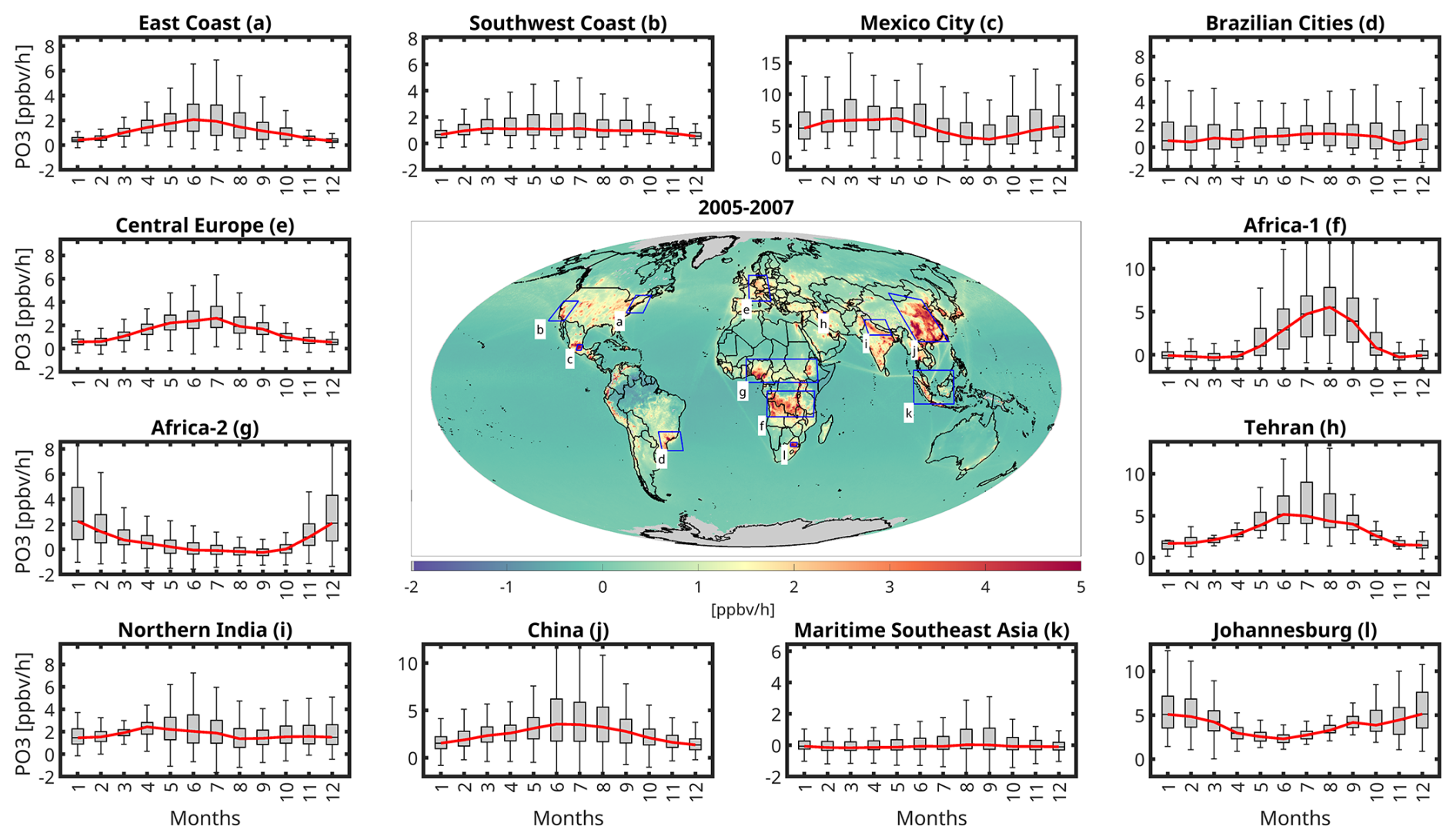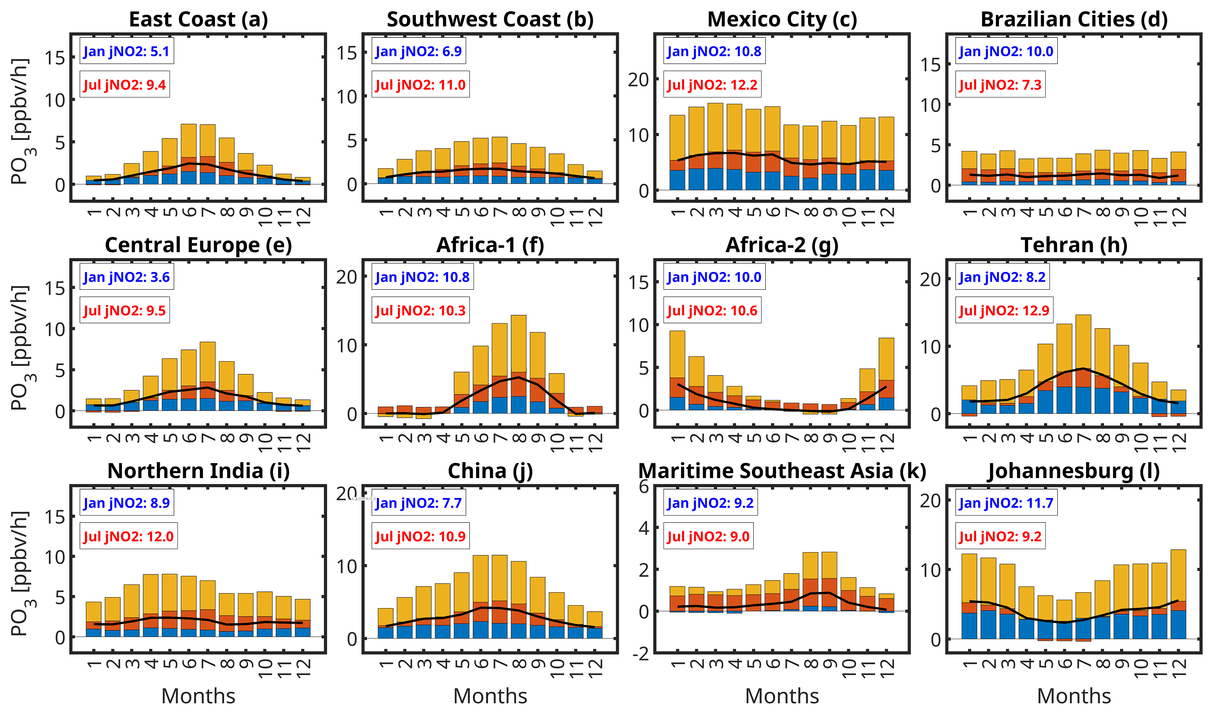 Creating global maps of PO3 and its sensitivity at spatiotemporal scales relevant to air quality policies is a challenge. Unique instruments can directly measure PO3 by calculating the difference in ozone molecules from air samples drawn through two distinct tubes – one exposed to sunlight and the other shielded by an ultra-violet (UV) filter (Cazorla and Brune, 2010; Sadanaga et al., 2017; Sklaveniti et al., 2018). However, these instruments suffer from various interferences, such as heterogeneous chemistry or photo-enhanced loss of ozone within the tubes, and they are limited to sparse super sites that restrict spatial variability. Similarly, box-model simulations of PO3, which are observationally constrained by intensive atmospheric composition measurements, are also limited by sparse aircraft sampling (Cazorla et al., 2012; Ren et al., 2013; Mazzuca et al., 2016; Souri et al., 2020a; Schroeder et al., 2020; Brune et al., 2022; Wolfe et al., 2022; Souri et al., 2023a). Currently, our understanding of the global spatiotemporal variability of PO3 mainly relies on chemical transport models, which can possess significant uncertainties such as those associated with transport, emissions, and dry deposition. Moreover, they may lack the spatial resolution necessary to capture the non-linear dynamics associated with NOx and thus, ozone chemistry (Valin et al., 2011; Vinken et al., 2011; Yu et al., 2016).