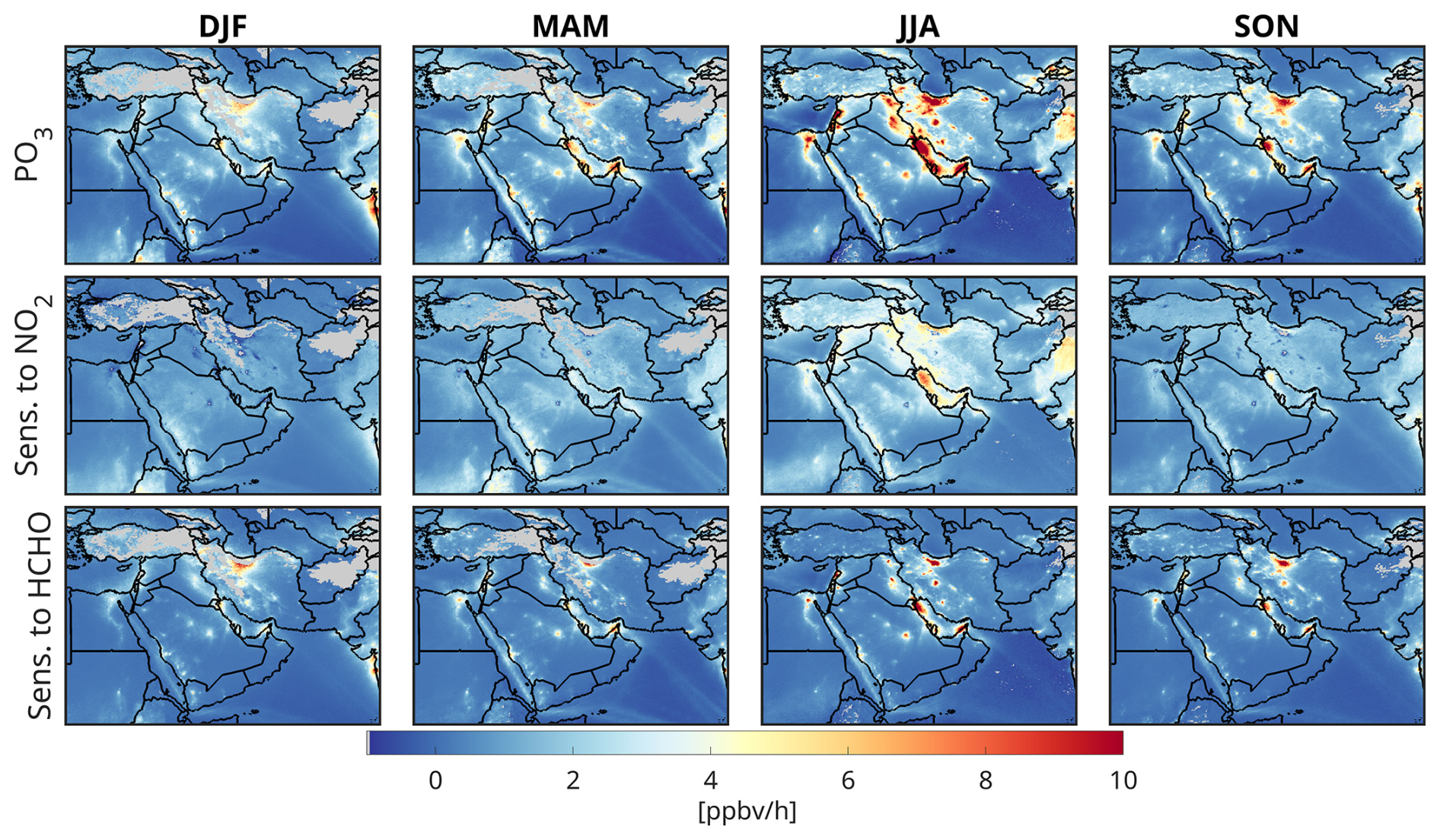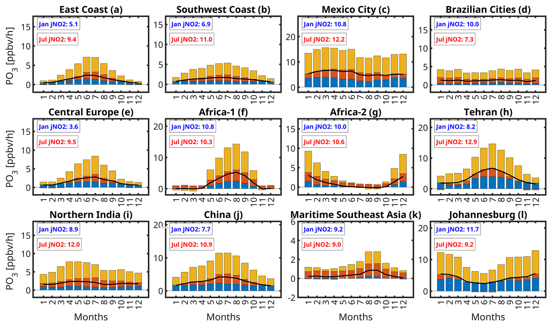To mitigate tropospheric ozone pollution, a pervasive trace gas that impacts human health, climate, and crop productivity (Fleming et al., 2018; Mills et al., 2018; Gaudel et al., 2018), it is essential to quantify the spatiotemporal variations of two primary components: (i) the sensitivity of the chemical net production rates of ozone (PO3) to its two main precursors, nitrogen oxides (NOx= NO + NO2) and volatile organic compounds (VOCs), and (ii) the magnitude of PO3 itself. The first component provides insights into the positive and negative contributions of these precursors to PO3, which are typically categorized as NOx-sensitive (where PO3 is influenced mainly by NOx), VOC-sensitive (where PO3 is affected primarily by VOCs), and transitional regimes (where PO3 is responsive to both NOx and VOCs) (Kleinman et al., 2002; Sillman and He, 2002; Duncan et al., 2010). The latter component is crucial for understanding how locally produced ozone, in conjunction with advected or diffused ozone, can lead to high-ozone events (e.g., Kleinman et al., 2002, 2005; Sullivan et al., 2019).