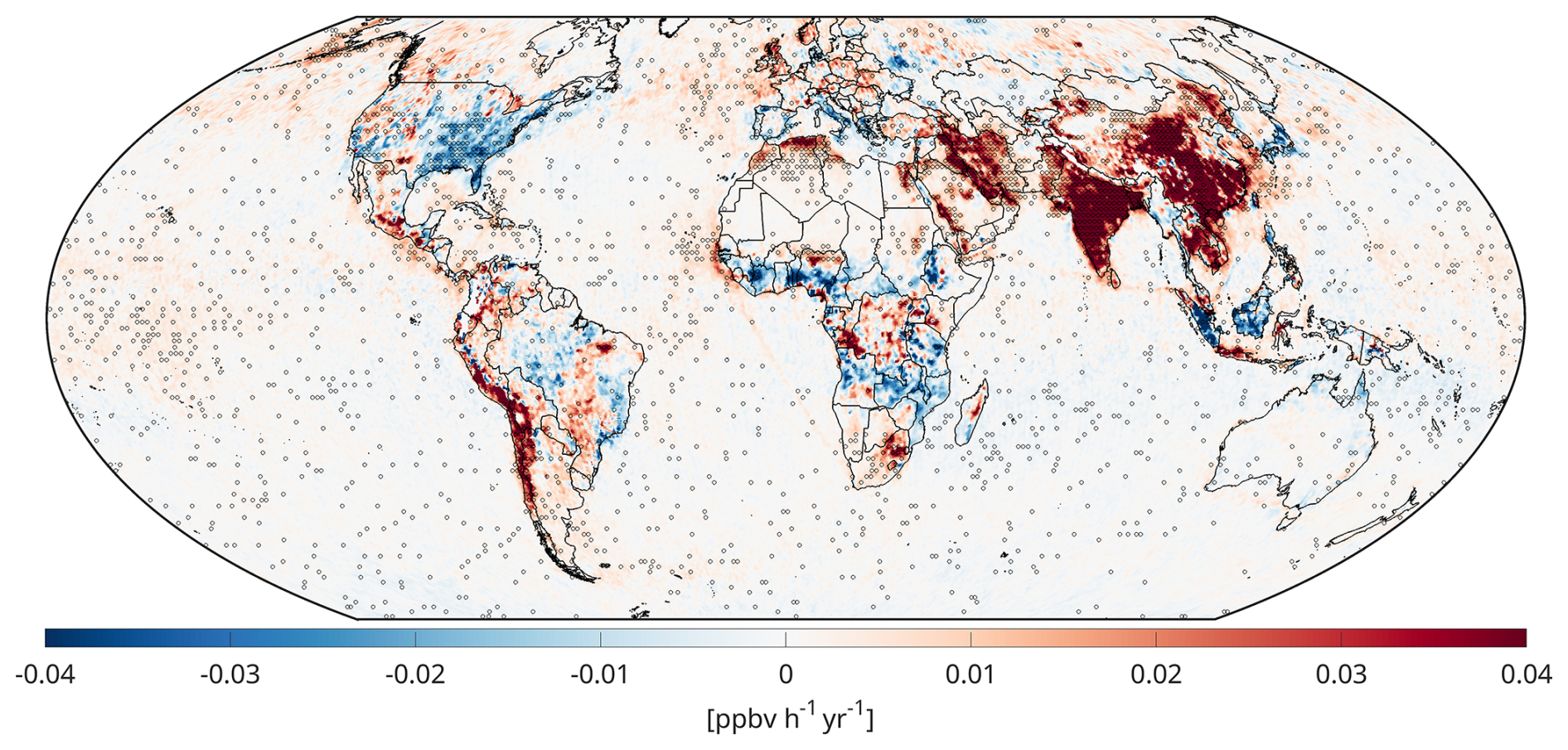 We also use the OMI Smithsonian astrophysical observatory (SAO) daily HCHO Level 2 product from the same sensor, which is generated using a newly developed algorithm and Collection 4 OMI radiances (Ayazpour et al. 2025; Nowlan et al., 2023). This improved algorithm enhances the radiance information content used to retrieved HCHO columns, significantly reducing noise in the slant column fit. The stability of this product in extracting new information related to long-term global trends of HCHO has been well demonstrated in recent studies (Souri et al., 2024; Anderson et al., 2024). We include only good data following the quality flag provided with the dataset along with effective cloud fraction below 40 %. Both OMI products are mapped onto a global grid with a resolution of 0.25° × 0.25° using the same algorithm used for TROPOMI daily.