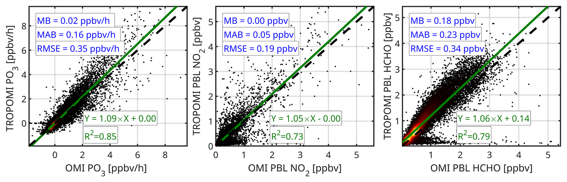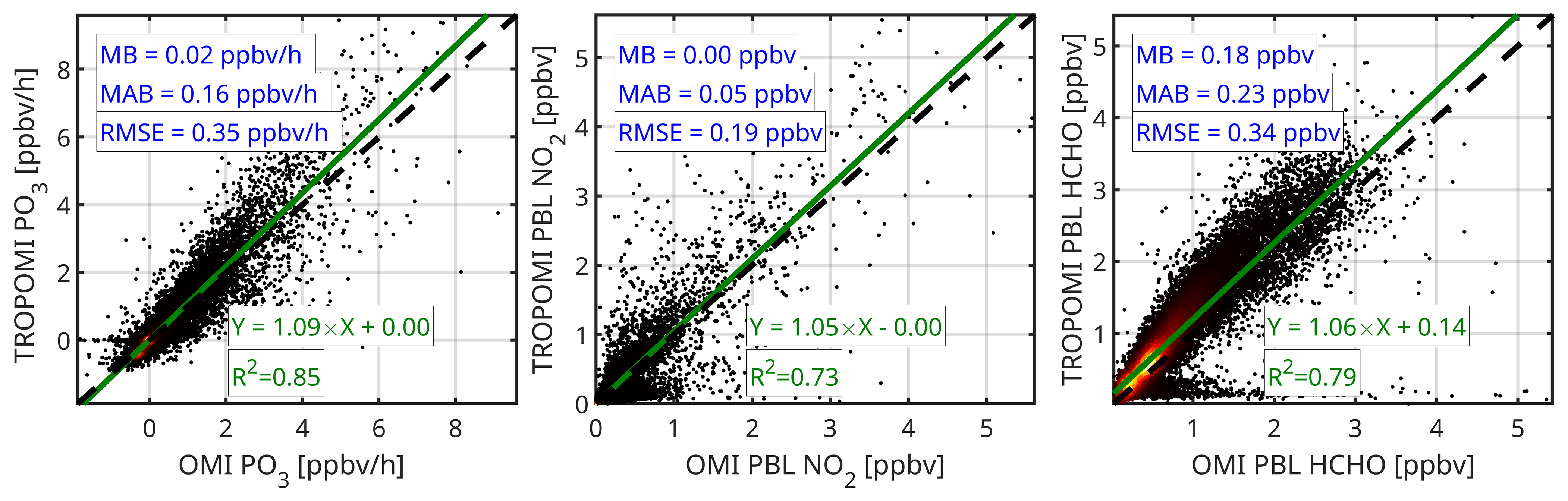 At the expense of sacrificing the full capability of a physics-based model, we can take advantage of a statistical approach to predict PO3 using several observable variables with improved computational efficiency. Chatfield et al. (2010) made an early effort to parameterize the gross production of ozone via NO + HO2 through a multivariable power law function that depended on formaldehyde (HCHO), nitrogen dioxide (NO2), UV photolysis rates, and ambient temperature. Their model successfully reproduced over 60 % of the variance observed in the ozone gross production rates. Souri et al. (2023a) introduced a bilinear equation based on HCHO × NO2 and HCHO/NO2, which explained more than 80 % of the variance in simulated PO3. Building on these findings, Souri et al. (2025) developed a regularized piece-wise linear regression to parameterize PO3 using retrospective aircraft observations and a set of variables, including HCHO/NO2, HCHO, NO2, jO1D (photolysis frequency for O1D +hv), and jNO2 (photolysis frequency for NO2+hv). Their algorithm successfully reproduced over 90 % of the variance in observationally-constrained PO3 with minimal biases across moderately to extremely polluted regions.