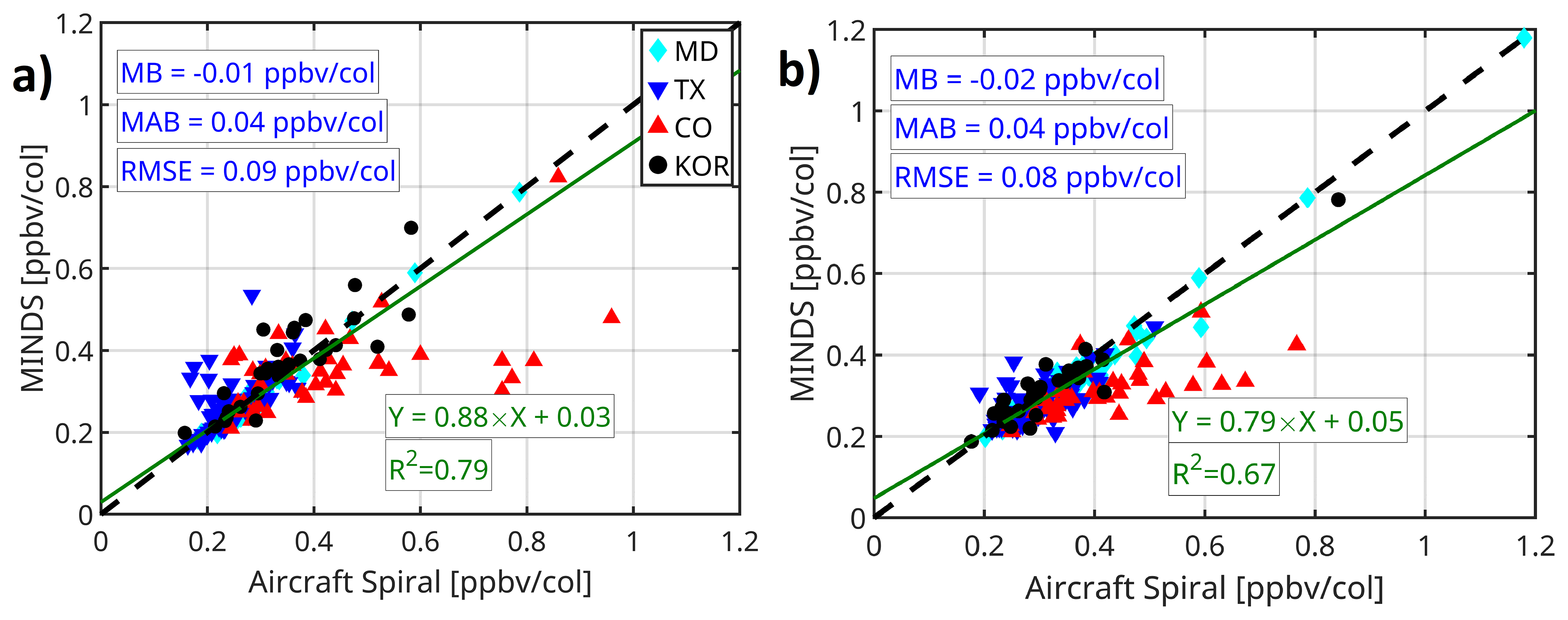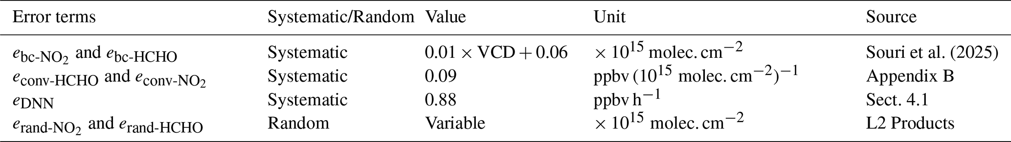 where γ is the conversion factor of the satellite total to the PBL columns translation based on MINDS and the formulation by Souri et al. (2025); ebc-HCHO and ebc-NO2, in column units, are calculated following the formulation from Souri et al. (2025) who used the errors of slope and offset obtained from the comparison of satellite VCDs to ground remote sensing benchmarks; econv-HCHO and econv-NO2 are quantified by validating the simulated conversion factors compared to those of aircraft vertical spirals (Appendix B). The unit for these two errors is ppbv per the column unit; accordingly, we multiply these terms to satellite VCDs. The last term in Eq. (5) is a fixed systematic error associated with the DNN estimates which will be quantified based on the MSE of the DNN prediction. Both PO3HCHO and PO3NO2 are derived from the sensitivity calculations from Eq. (3) divided by the satellite columns. All error terms in Eqs. (6)–(9) are spatially and temporally invariant, but the derivatives vary from pixel to pixel resulting in spatiotemporally-varying systematic errors.