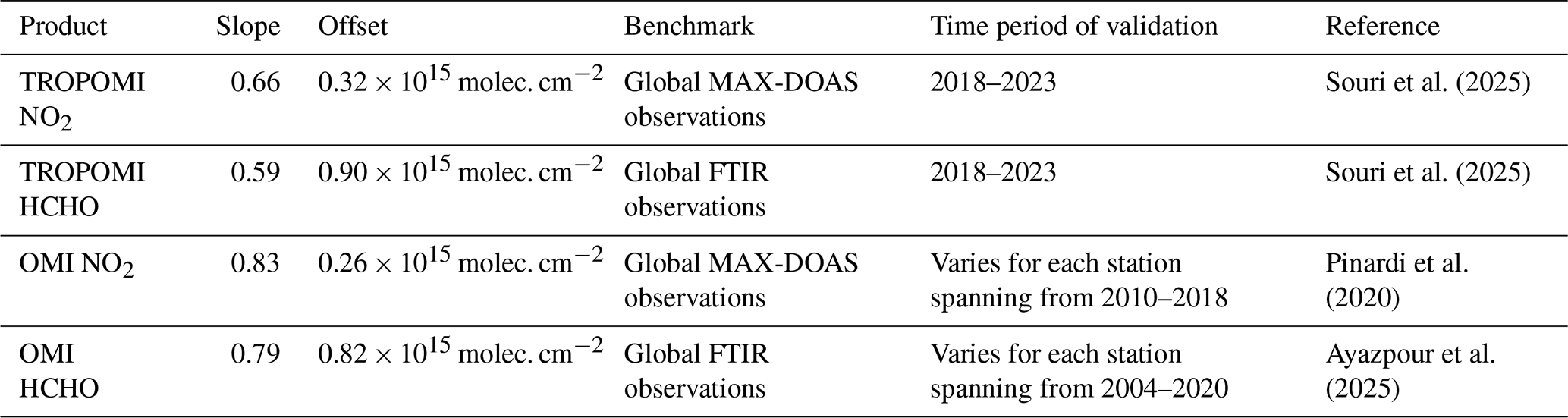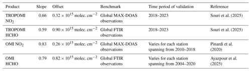 In order to remove large biases in both TROPOMI and OMI products, we bias correct their columns using the offset (additive term) and slope (multiplicative term) determined from a linear fit to paired MAX-DOAS/FTIR and these datasets, as described by Souri et al. (2025). The rationale for defining retrieval biases as a function of magnitude is to enhance correction factor generalizability across seasons and locations. We take advantage of three studies characterizing the bias correction factors, listed in Table 1. The application of these correction factors yields consistency across OMI and TROPOMI NO2 and HCHO columns within 10 % (Sect. 4.4.4)