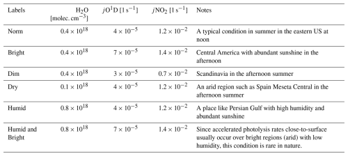 To estimate jNO2 and jO1D, we refer to a detailed look-up table provided by the Framework for 0-D Atmospheric Modeling (F0AM) model (Wolfe et al. 2016). This table is developed for clear-sky conditions based on over 20 064 solar spectra calculations. The data encompasses a broad spectrum of solar zenith angles (SZA) from 0 to 90° in 5° increments, altitudes ranging from 0 to 15 km in 1 km steps, overhead total ozone columns from 100 to 600 DU in increments of 50 DU, and surface UV albedo values from 0 to 1 in 0.2 increments. These calculations were carried out using NCAR's Tropospheric Ultraviolet and Visible radiation model (TUV v5.2), along with cross sections and quantum yields from IUPAC and JPL (Wolfe et al., 2016). Information on SZA and surface elevation is obtained from the L2 TROPOMI/OMI granule data. Surface albedo is based on the TROPOMI DLER climatology (Sect. 2.1.4). The overhead total ozone columns are derived from MINDS simulations (Sect. 2.3). For any values that fall between the entries in the tables, we apply a linear interpolation method.