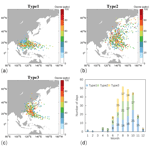 For clarity, these three typhoon types are, respectively designated as: Type 1: Westward-moving typhoons; Type 2: Distant northward-recurving typhoons; Type 3: Proximal northward-recurving typhoons. Temporal distribution analysis (Fig. 1d) reveals that both Type 1 and Type 2 primarily occur from July to November, with peak frequency in autumn, while Type 3 is predominantly observed from July to September, showing maximum occurrence during summer.