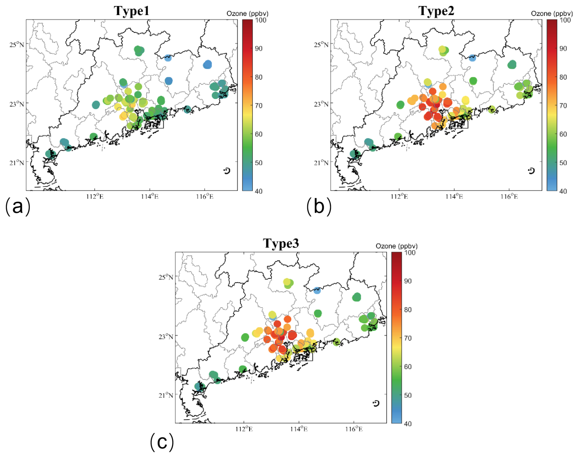We extracted the MDA8 O3 concentrations during each typhoon event and calculated Type-specific averages to examine ozone distribution patterns in Guangdong under different typhoon types (Fig. 2). The results demonstrate that: Type 1 corresponds to MDA8 O3 concentrations ranging 9.2–70.9 ppbv, with an average of 20 monitoring stations exceeding standards. Type 2 shows MDA8 O3 concentrations of 12.2–90.3 ppbv, averaging 34 exceedance stations. Type 3 exhibits MDA8 O3 concentrations of 3.3–89.7 ppbv, with 35 stations exceeding limits on average. The spatial analysis reveals that ozone hotspots for all types consistently cluster in central Guangdong, indicating similar spatial distribution patterns despite varying intensity. Type 3 exhibited the highest number of non-compliant monitoring sites, while Type 1 showed the lowest count.