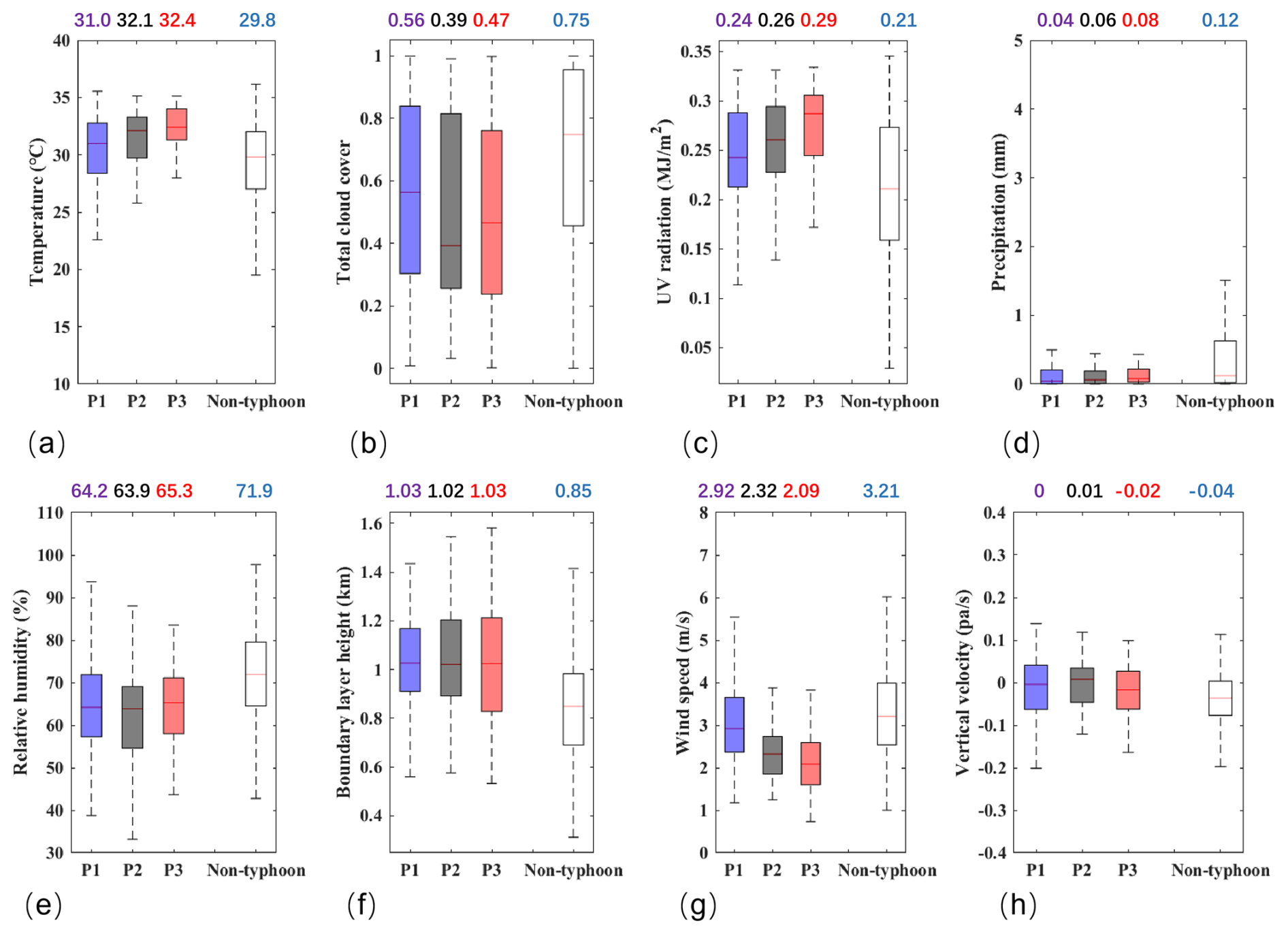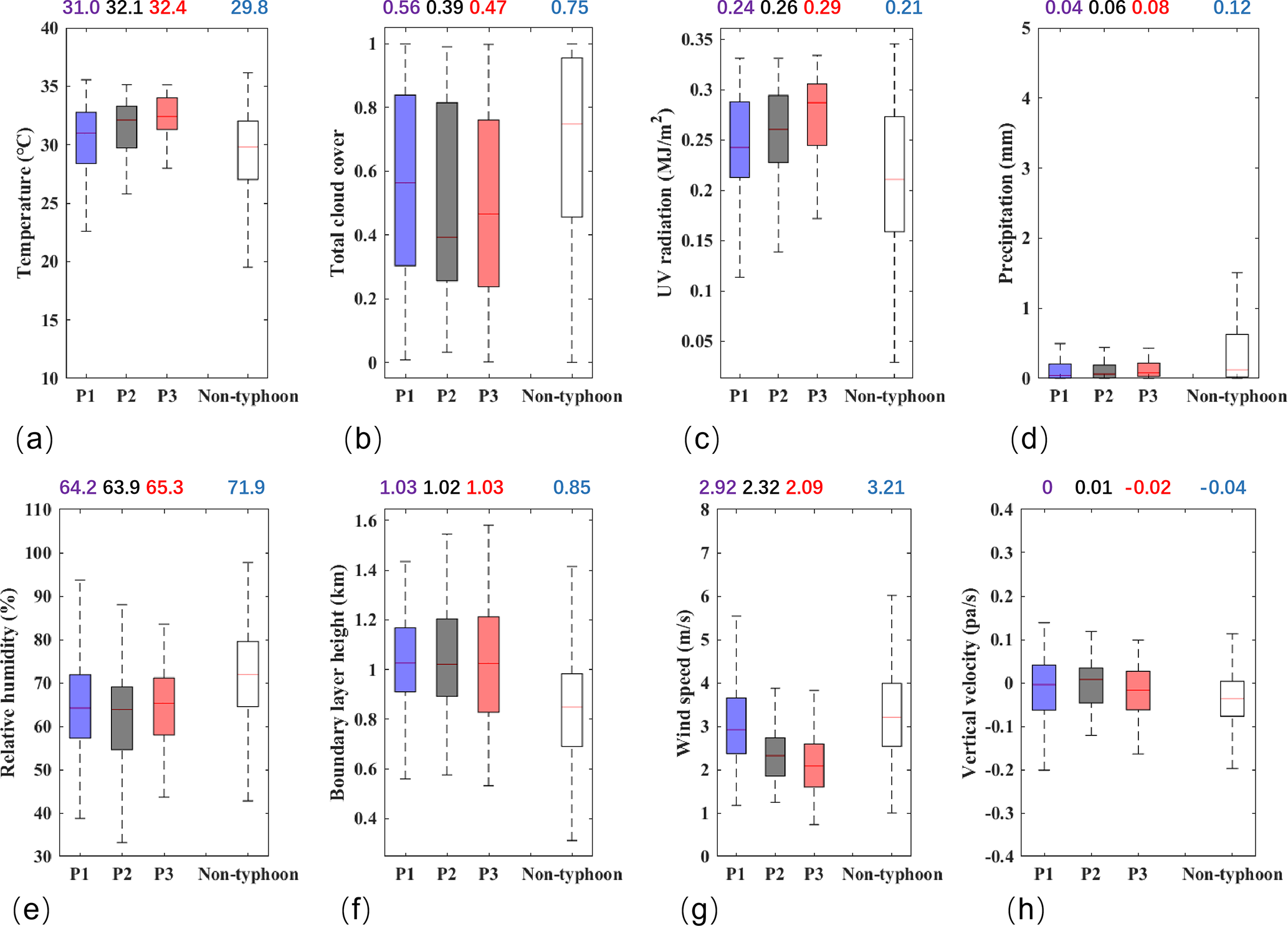 Figure 3Comparison of meteorological conditions between typhoon and non-typhoon weather. (a–f) represent 2 m temperature, total cloud cover, surface solar radiation, precipitation, relative humidity, boundary layer height, 10 m wind speed, and vertical velocity at 850 hPa, respectively. P1, P2, and P3 denote three distinct typhoon tracks, while Non-typhoon refers to non-typhoon conditions. The numerical values above each boxplot indicate the median of the corresponding dataset.