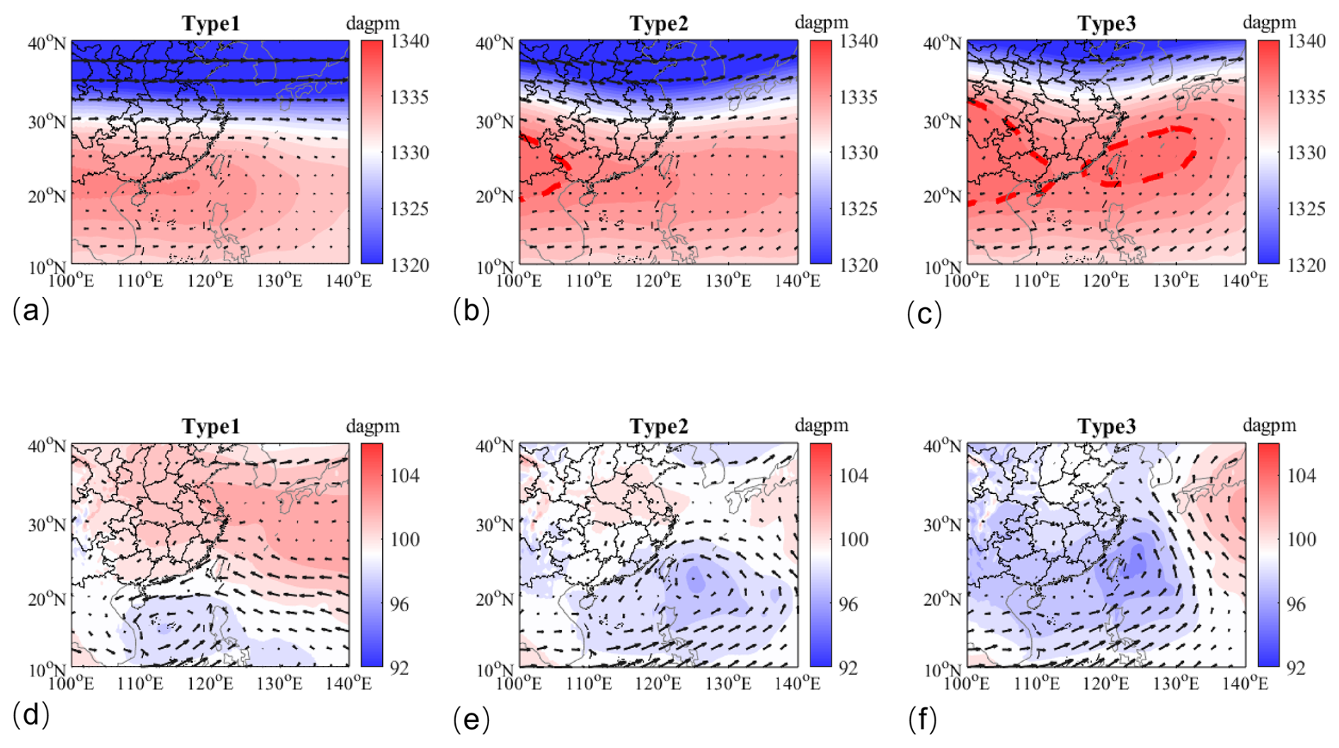 Through k-means clustering analysis, the 237 typhoon tracks over the western Pacific from 2013 to 2023 were classified into three distinct types (Fig. 1a–c). Type 1 comprises typhoons that form in the western Pacific, move into the South China Sea, and subsequently make landfall in South China or pass through its southern maritime areas (total: 105 cases). Type 2 consists of typhoons originating from low-latitude regions of the western Pacific that approach China before recurring northward, traversing Japan and Korea before returning to the western Pacific basin (total: 77 cases). Type 3 represents typhoons generated in low-latitude western Pacific regions that approach China and recurve northward, ultimately making landfall in China or dissipating near Japan/Korea (total: 55 cases).