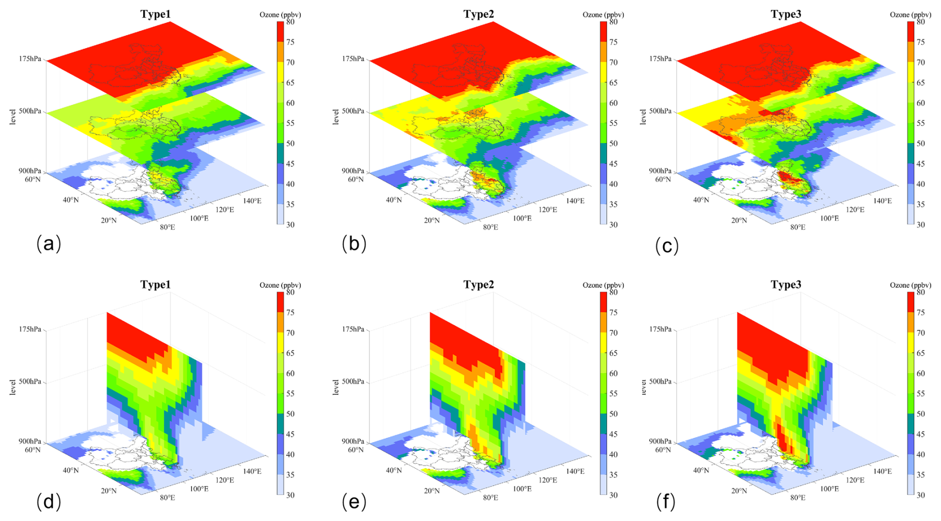 Figure 5Three-dimensional spatial distribution of ozone under different typhoon tracks. (a–c) Horizontal ozone distributions at 900, 500, and 175 hPa for the three typhoon track types. (d–f) Horizontal ozone distributions at 900 hPa and corresponding vertical cross-sections along 114° E for each typhoon type.