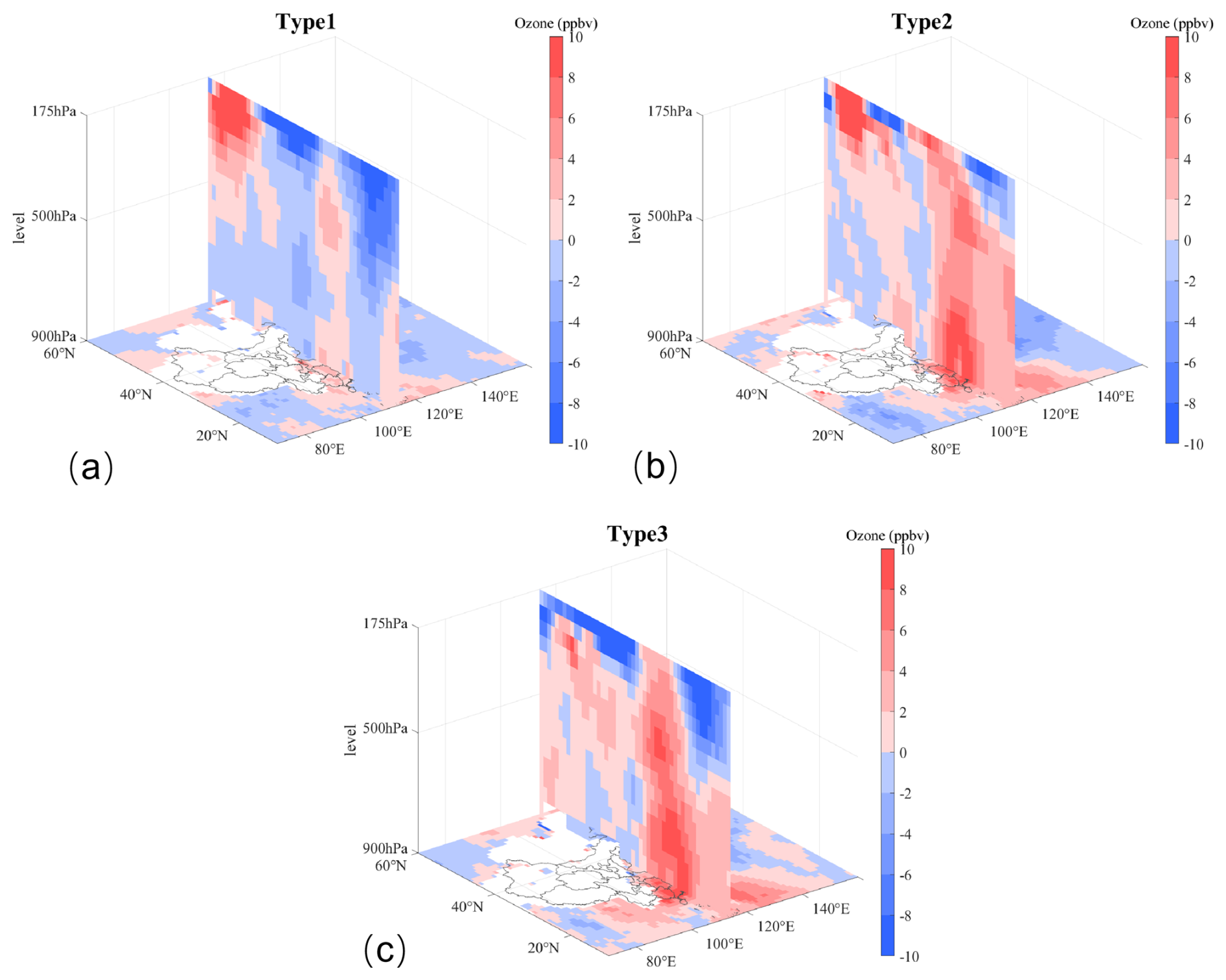 Under the influence of northward-moving typhoons (types 2 and 3), an anticyclone develops over western China at the 175 hPa level, positioned to the south of the westerly jet. This configuration leads to a more pronounced southerly wind anomaly in the right exit region of the westerly jet. This process triggers the subsidence of high-concentration ozone from the upper troposphere, accompanied by pole-to-equator transport. Comparative analysis between typhoon and non-typhoon conditions reveals that both types of northward-moving typhoons induce significant ozone enhancement throughout the vertical column, with increases ranging from 2.5 to 11.6 ppbv (Type 2) and 0.3 to 12.3 ppbv (Type 3).