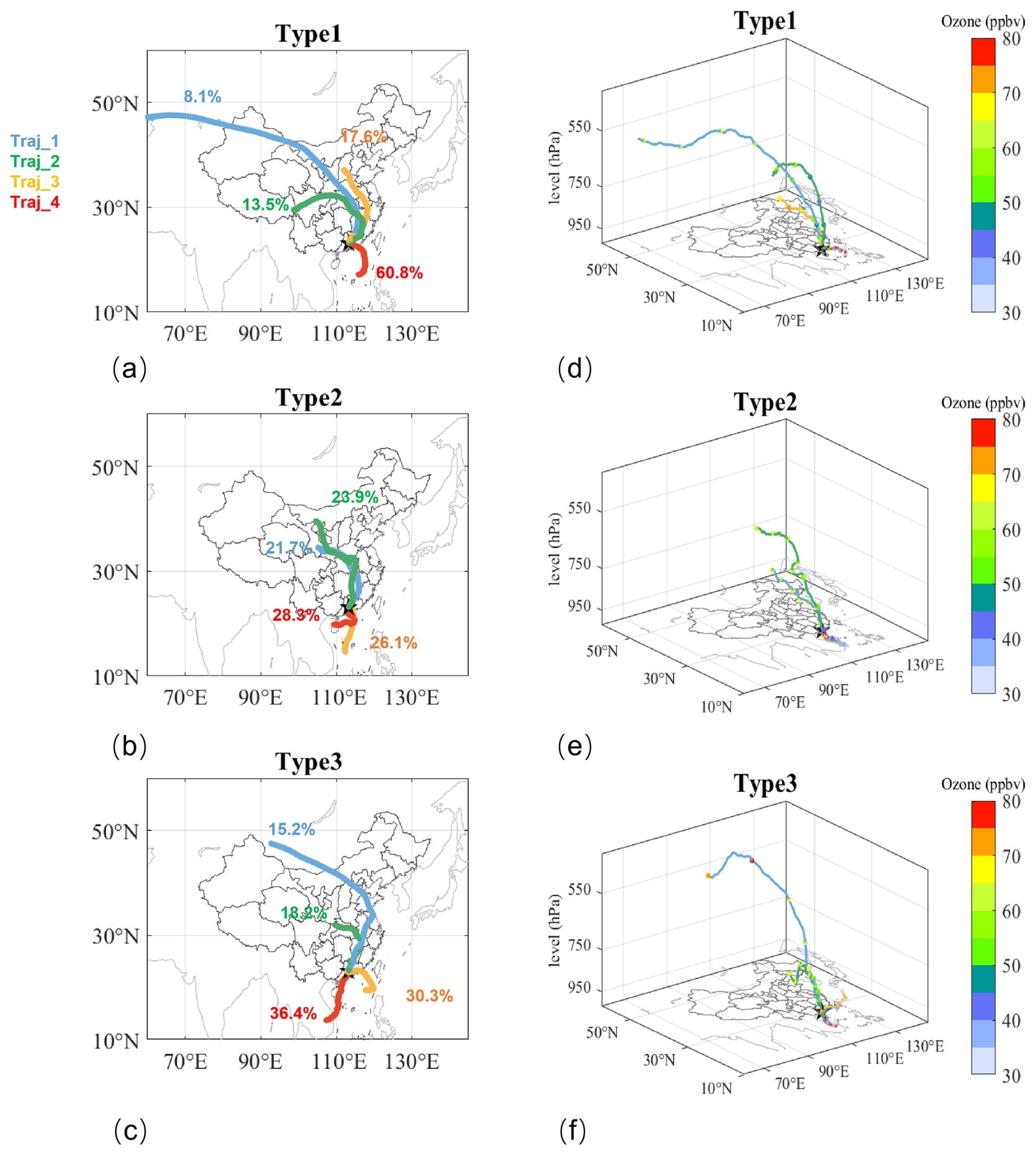 Figure 7Comparison of boundary-layer air mass trajectory sources under different typhoon tracks: (a–c) two-dimensional views with trajectory percentages indicated numerically; (d–f) three-dimensional views showing ozone concentrations (ppbv) along trajectories (marked by colored points); target regions are denoted by black pentagrams on maps.