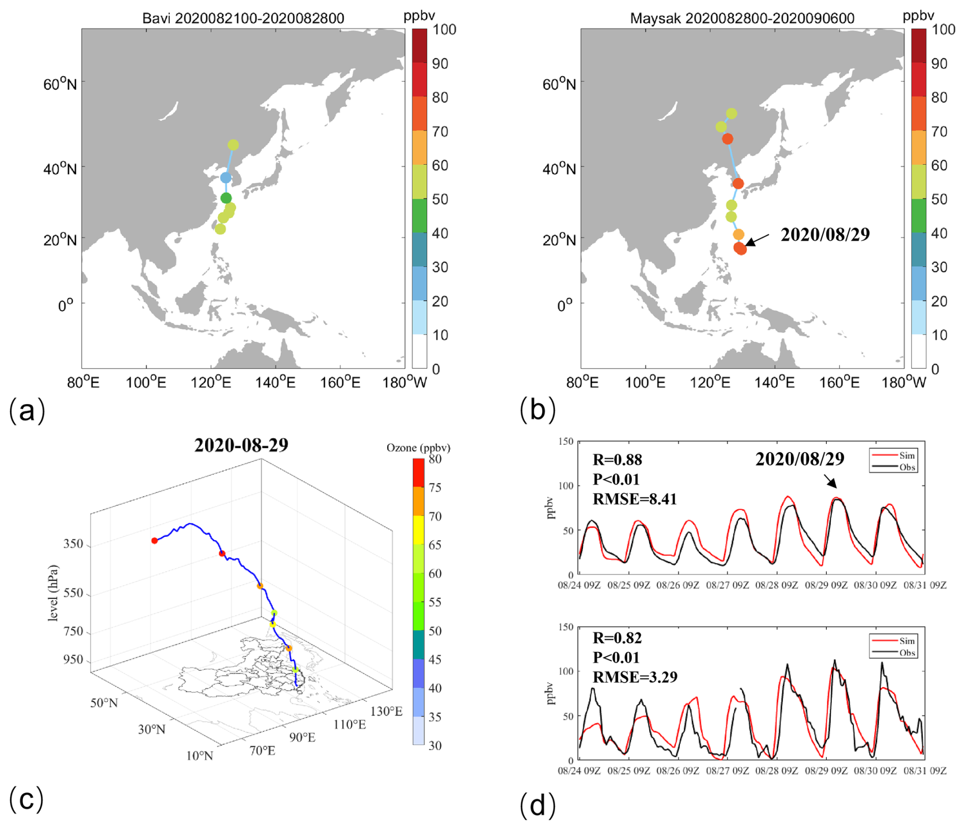 Figure 8Consecutive northward-moving typhoon tracks, backward trajectories, and ozone variations. (a, b) Typhoon paths with corresponding MDA8 ozone concentrations in Guangdong province; (c) Backward trajectories at 13:00 LST on 29 August 2020; (d) WRF-CMAQ simulated ozone variations (upper panel: average across 105 Guangdong monitoring stations; lower panel: Foshan Sanshui station (23.15° N, 112.8° E) observations, with red lines indicating simulated values and black lines representing monitored concentrations).