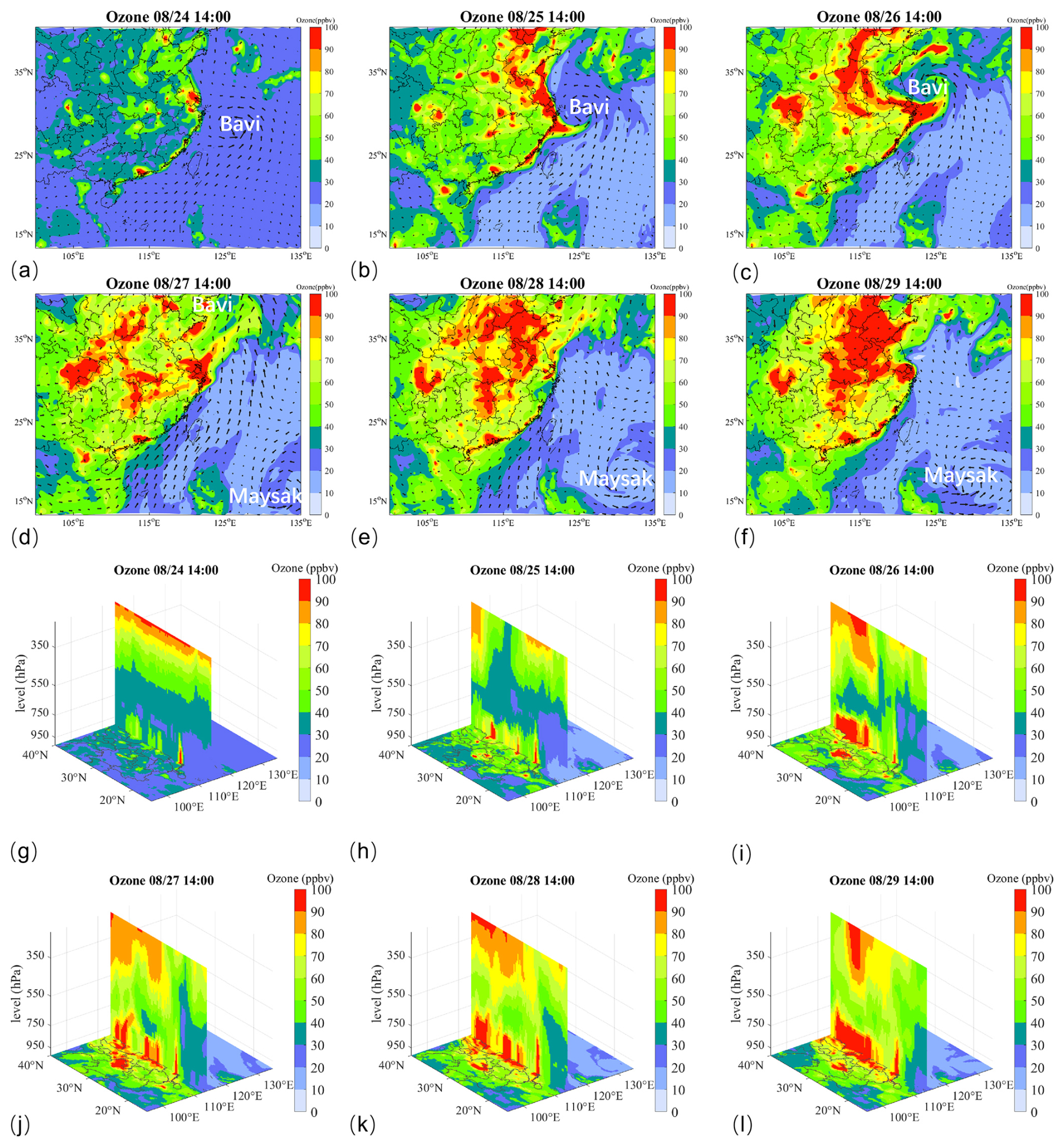 From 24 to 27 August, Typhoon Bavi was located along the eastern coastal region of China, moving northward before gradually dissipating. From 28 to 31 August, Typhoon Maysak emerged in the South China Sea and progressively approached the Chinese mainland. During this period, we analyzed variations in surface ozone concentrations and their vertical distribution under the influence of these consecutive northward-moving typhoons, based on model simulation results (Fig. 9). The results show that the variation in surface ozone distribution can be divided into two stages: The first stage occurred under the influence of Typhoon Bavi, when surface ozone concentrations rapidly increased in the Beijing–Tianjin–Hebei region, Yangtze River Delta, and Pearl River Delta, and was rapidly transported to southwestern China by circulation. The second stage occurred under the influence of Typhoon Maysak, when ozone concentrations continued to rise across most regions of China. Compared with the first stage, horizontal ozone transport was not significant during the second stage (Fig. 9a–f). In the vertical dimension, the consecutive northward-moving typhoons triggered a sustained downward transport process of ozone. Beginning on 25 August, downward ozone transport was observed in the upper atmosphere between 35 and 40° N. From 26 to 29 August, the zone of ozone subsidence gradually expanded southward, leading to a significant increase in ozone concentrations over Guangdong Province (Fig. 9g–l).