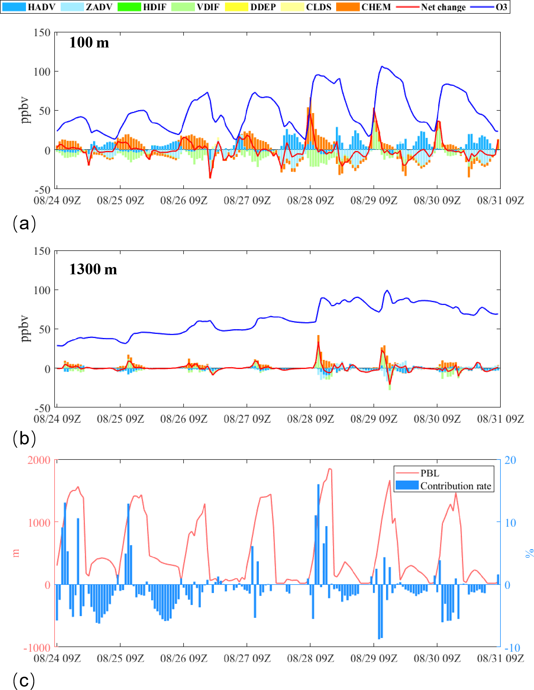 To quantitatively analyze the contribution of vertical transport to ozone concentrations within the boundary layer, we employed the IPR (Integrated Process Rate) analysis method to decompose ozone sources and sinks across the study area. A detailed analysis was conducted using results from the Sanshui station at 100 and 1300 m altitudes (Fig. 10a and b). Subsequently, we calculated the contribution rate of cross-boundary-layer vertical transport to ozone concentrations in the boundary layer at each time point (Fig. 10c) using the following formula (Chen et al., 2022a):