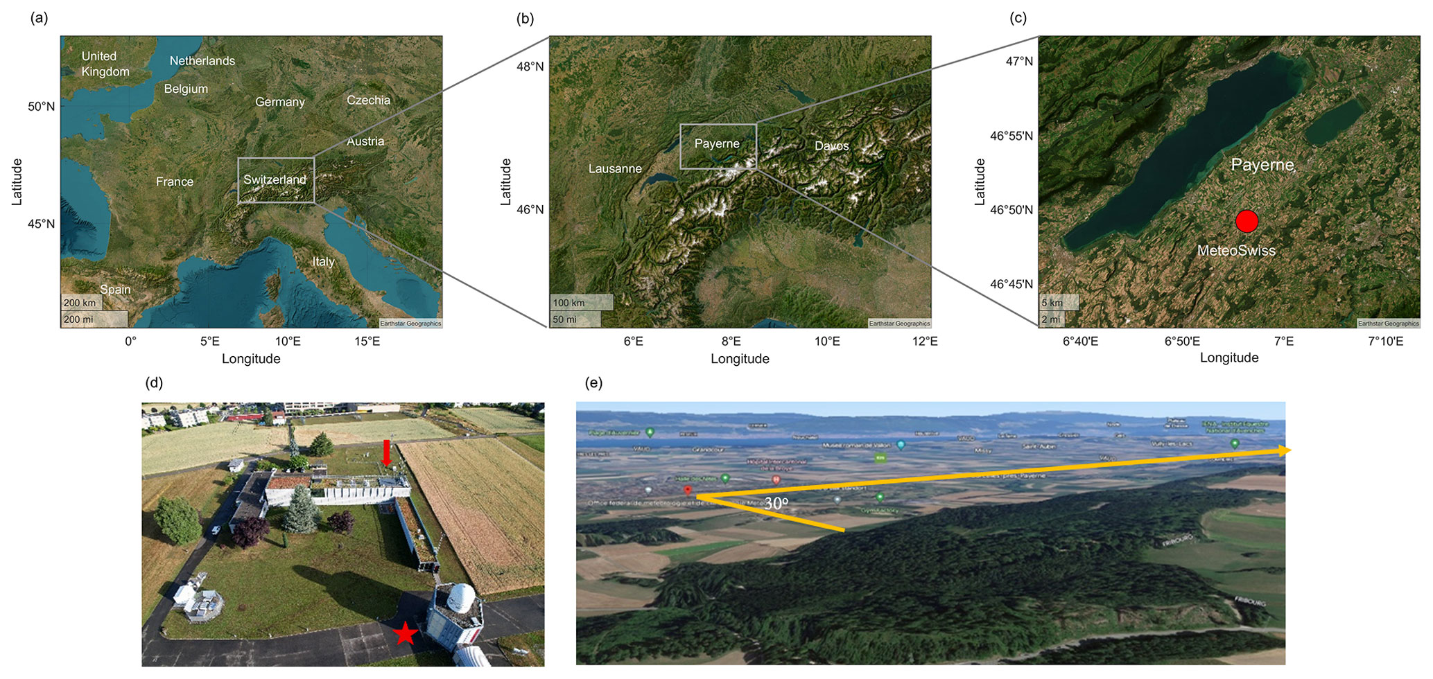 Figure 1(a) The study area of Switzerland (b) the sub-domain over Payerne (c) the experimental site of MeteoSwiss in Payerne (d) MeteoSwiss in Payerne, the roof of MeteoSwiss is indicated by the vertical arrow and the position of the lidar by an asterisk (e) the emitted laser beam (30° elevation angle to the ground) passing over the nearby hill by 50–200 m (right). © Google Maps 2025.