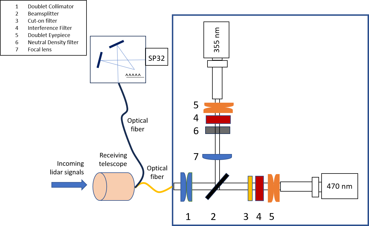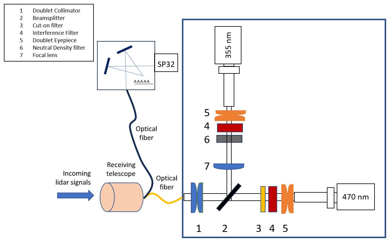 Remote sensing instrumentation was used, including a LIF lidar and a multispectral lidar detector, to retrieve vertical profiles of aerosol backscatter (baer) coefficients at 355 nm and the corresponding bioaerosol fluorescence backscatter coefficients. The lidar system is based on a pulsed Nd:YAG laser (Lumibird Q-Smart 450) emitting at 355 nm with energy of 130 mJ per pulse at 10 Hz repetition frequency. The UV laser beam is emitted to the atmosphere through a Pelin-Broca prism and a 10 × diameter expander at an elevation angle of 30°, pointing northward and passing at  50–200 m [relevant (start-end) distance of the laser beam to the surface of the mountain over a nearby hill (cf. Fig. 1, lower right). A 150 mm diameter Cassegrainian telescope (focal length f=1125 mm) was used to collect the backscattered lidar signals and fed them to a filter spectrometer through a SiO2 optical fiber having a numerical angle NA = 0.2 (cf. Fig. 2). At the entrance of the spectrometer a double achromatic lens (1) collimates the incoming beam, while a dichroic beam splitter (2) reflects the 355 nm lidar signal to a focal lens (7), then to a neutral density filter (6) and to the photomultiplier tube (PMT) eyepiece doublet (5). The elastic lidar signals are filtered by an interference filter (4) centred at 355 nm (FWHM = 0.5 nm), while the LIF lidar signals pass through the dichroic beamsplitter and then through a cut-on long-pass optical filter (3) (FEL0400 Thorlabs GmbH) which transmits all wavelengths greater than 400 nm. An interference filter centred at 470 nm (FF02-470/100-25 Semrock, FWHM = 100 nm) is used to detect the LIF lidar signals between 420–520 nm.