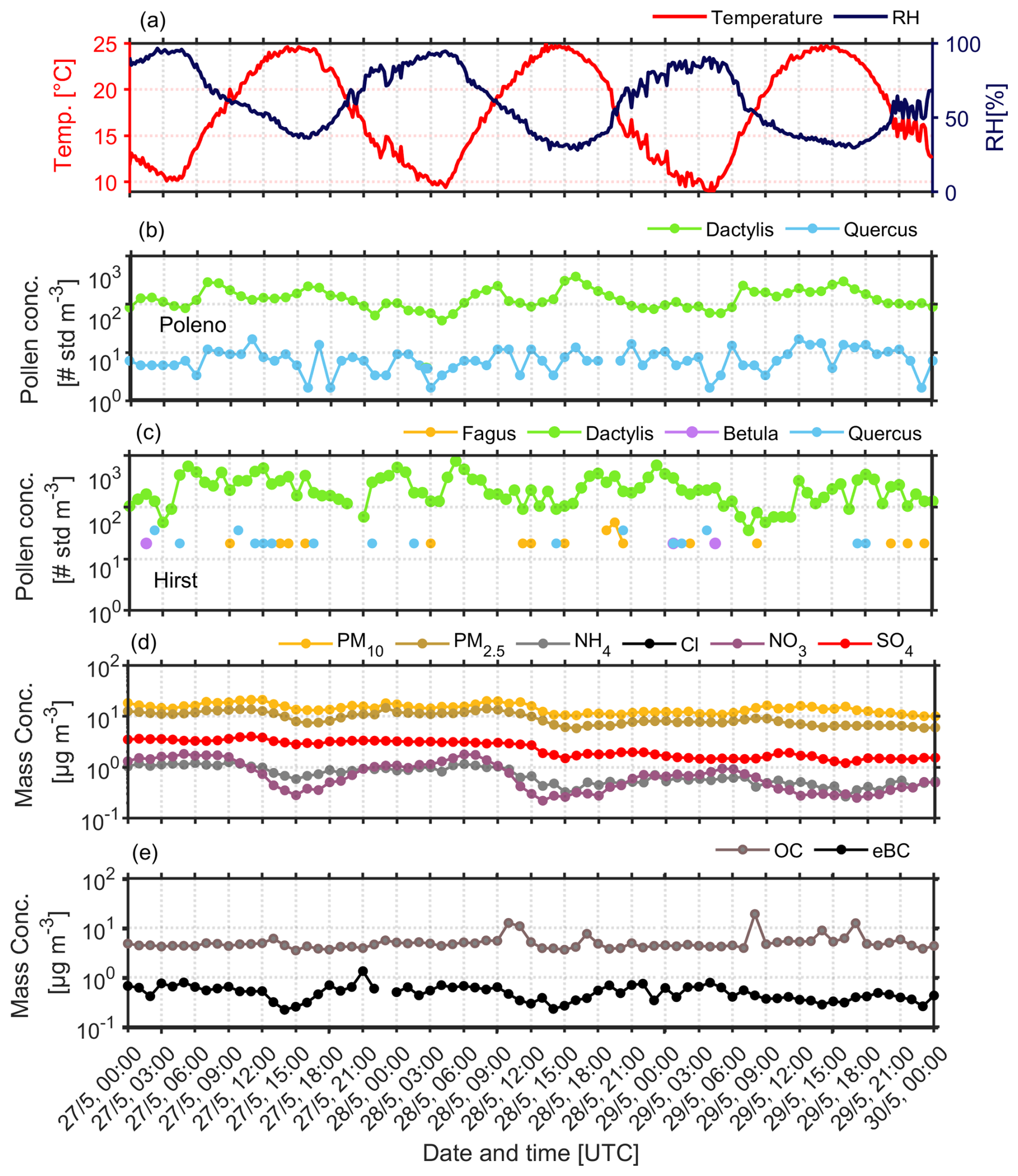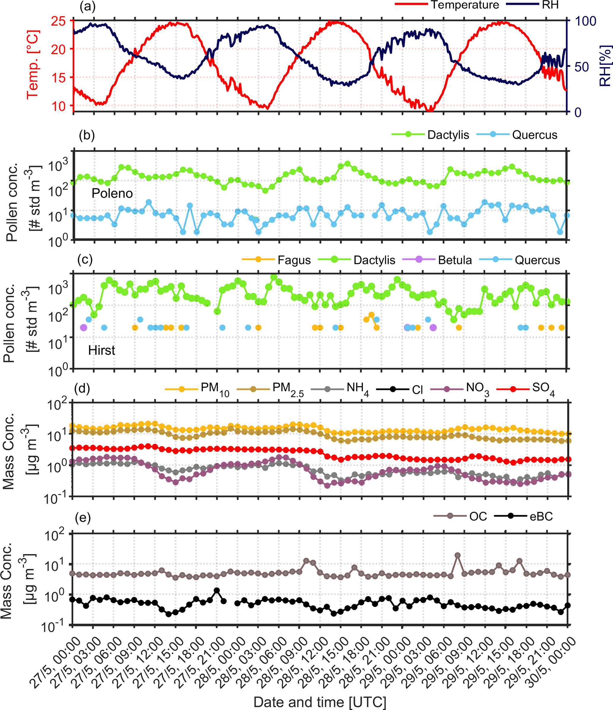 Figure 5Temporal variability of (a) hourly temperature and RH, pollen concentration obtained by (b) SwisensPoleno (c) Hirst (d) Mass concentration of PM10, PM2.5, NH4+, NO3-, SO42- and (e) OC, eBC at ground level for the period 27 to 30 May 2023.