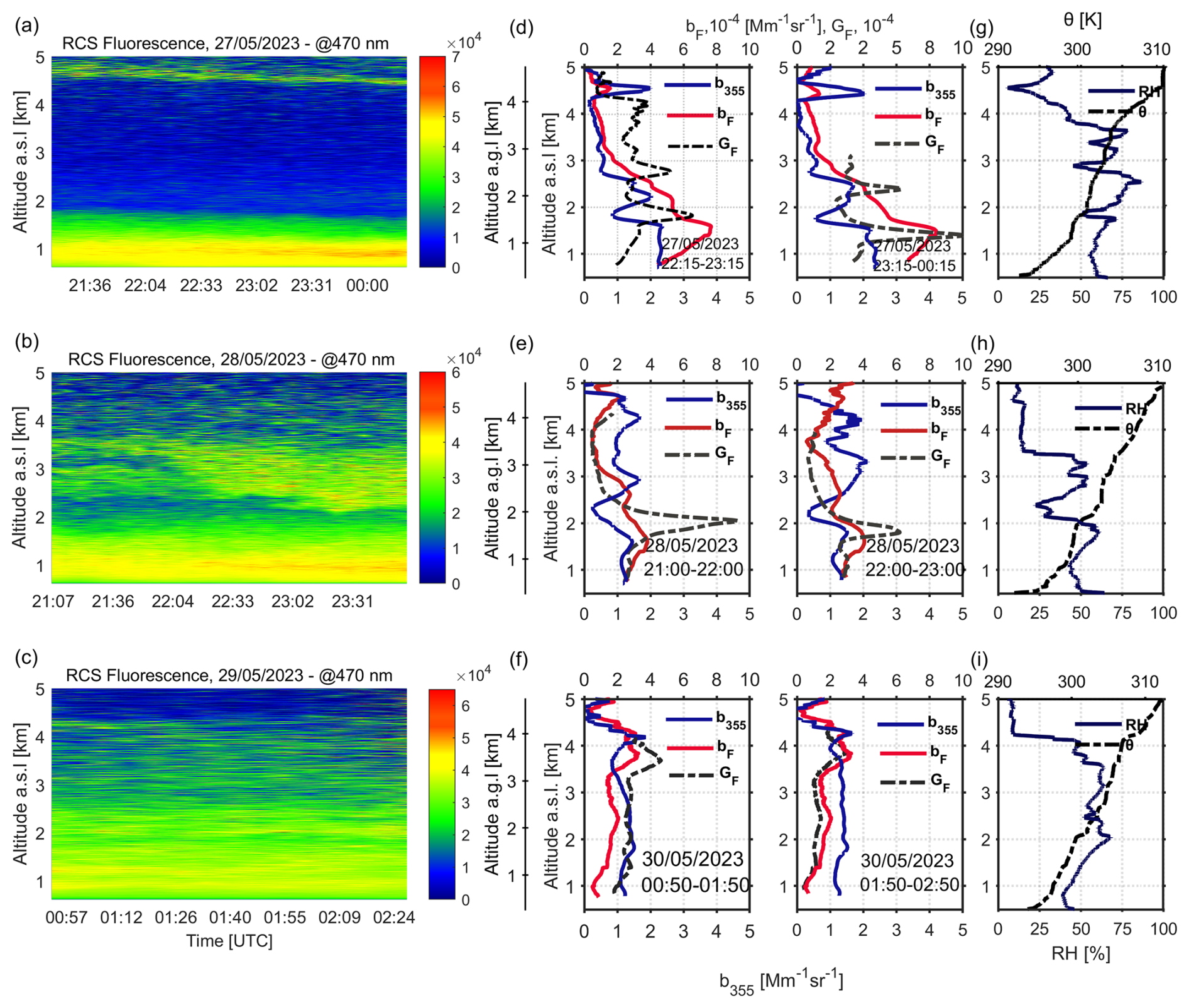 Figure 6(a–c) Spatio-temporal evolution of the range-corrected lidar signal (RCS) at the fluorescence channel (470 nm) (d–f) aerosol b355 and fluorescence bF backscatter coefficients and GF profiles (hourly means, with times indicated in the plots) (g–i) RH and θ as obtained by radiosonde launches around 23:00 UTC for the period 27–29 May 2023.
