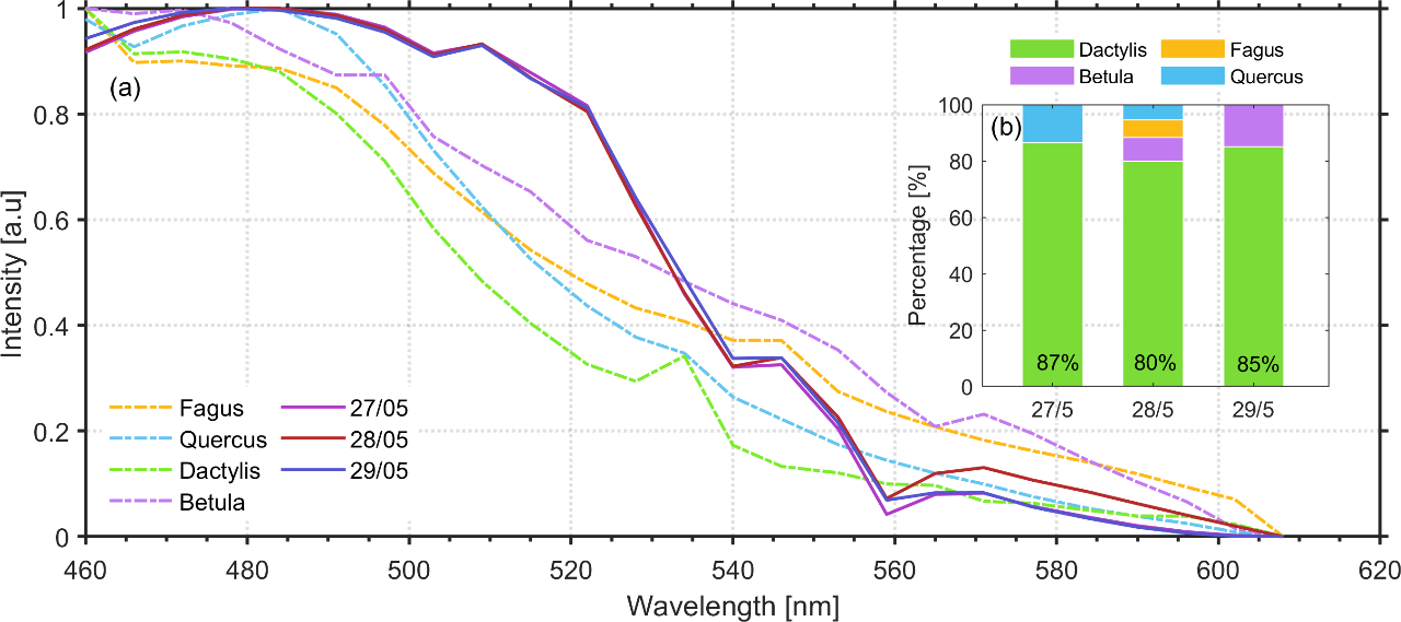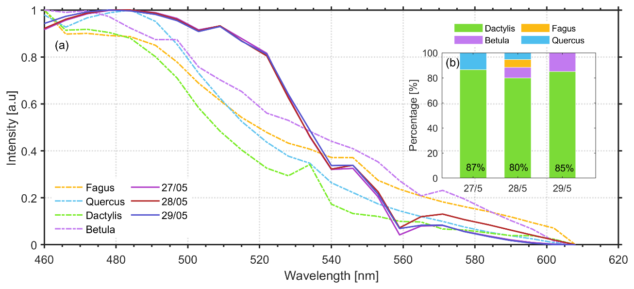 As a next step we spectrally decompose the fluorescence spectra obtained by the lidar multichannel spectrometer over 1 h period and averaged in the height region from ground up to 1.2 km a.s.l. (Fig. 7a) into the pollen types measured at ground level by SwisensPoleno and the Hirst trap, to examine the feasibility of the lidar multichannel spectrometer LIF technique to retrieve and categorise the different pollen types aloft. The validation of our methodology will refer to the ground pollen data with increased concentrations during the observation period from 27 to 29 May, Fagus, Betula and Quercus, with the grass pollen being the dominating pollen taxa (Fig. 5b, c). To this end, at first Fig. 7a presents the in vivo LIF fluorescence spectra (dashed lines) of four different pollen types (Dactylis glomerata (proxy for grass pollen), Fagus sylvatica, Betula pendula and Quercus robur) obtained by laser excitation at 355 nm under laboratory conditions (Richardson et al., 2019). Additionally, in the same figure we present the fluorescence spectra measured by the lidar multichannel spectrometer during the observation period from 27 to 29 May, averaged in the height region from ground up to 1.2 km a.s.l. height (continuous lines). Then, we followed the methodology explained in Sect. 3.2 applied to lidar multichannel spectrometer signals and the corresponding in vivo spectra of these selected pollen types. In Fig. 7b we quantify the presence of each pollen type aloft as a percentage of pollen counts for each day of the observed period. On 27 May, grass pollen was the most prevalent pollen type in the atmosphere, contributing to  87 % in the lidar multichannel spectrometer signal, while Quercus accounted for  13 %. These results are in accordance with the in situ data obtained from SwisensPoleno and Hirst (Fig. S2), where grass pollen represented 97 % and Quercus accounted for 3 %. On 28 May, the presence of grass pollen reached 80 %, with Betula, Fagus and Quercus reaching 8 %, 6 % and 5 %, respectively. In this case, the in situ data similarly indicated an increased percentage of grass pollen at approximately 95 %, with Quercus and Fagus contributing 4 % and 1 %, respectively, while Fagus concentrations were generally low or absent. On 29 May, the algorithm detected both grass pollen reaching a peak of 85 %, and Betula at 15 % (Fig. 7b), in accordance with the Hirst and SwisensPoleno data (see also Fig. 4), which indicated high concentration ( 250–300 particles m−3 at 23:00 UTC) of grass pollen along with a small presence of Quercus ( 10 particles m−3) concentrations, while Betula was absent at that day.