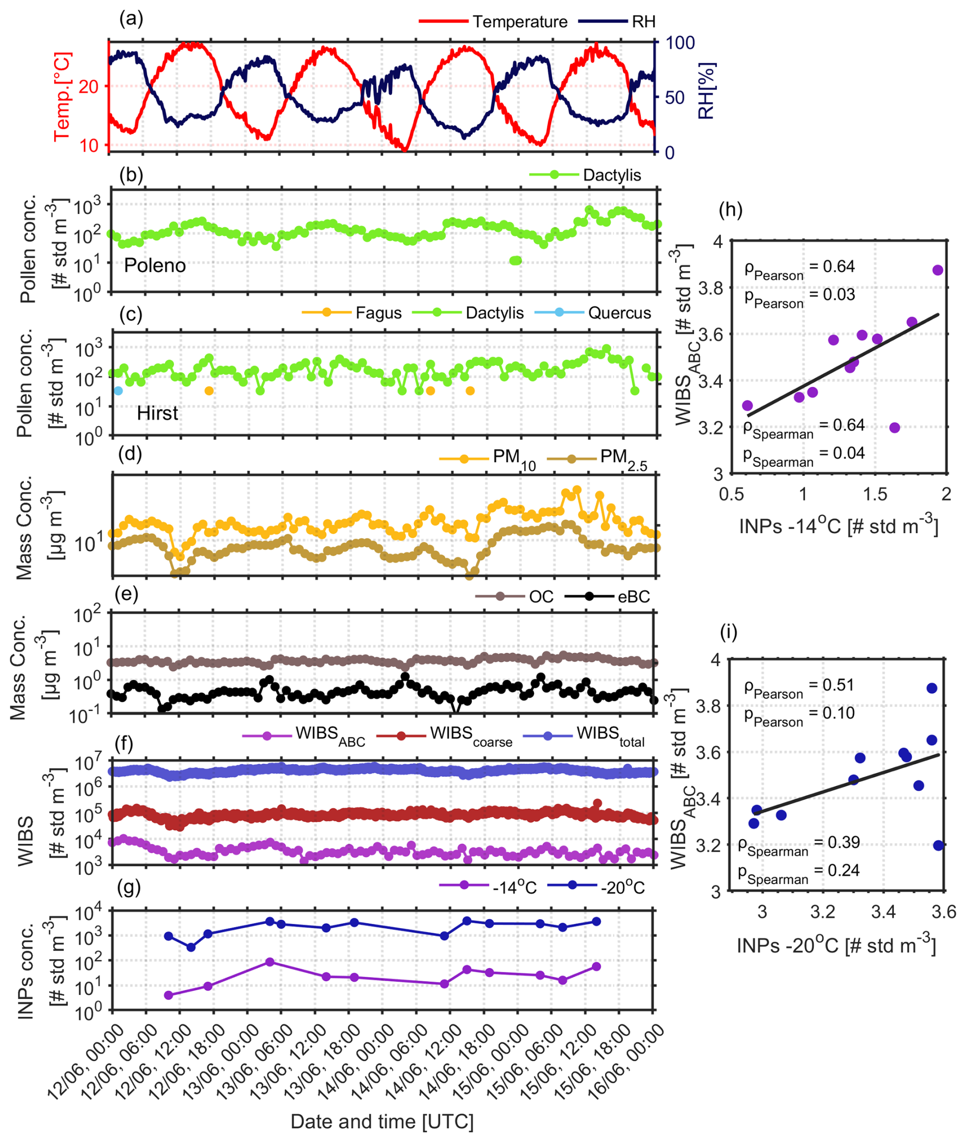 Figure 8(a) Temporal evolution of daily temperature and RH from MeteoSwiss data, as well as, evolution of the hourly pollen concentration obtained by (b) SwisensPoleno (c) Hirst (d) Mass concentration of PM10, PM2.5, and (e) OC, eBC at ground level, (f) WIBSABC, WIBScoarse, and WIBStotal particle number concentrations (g) INP concentrations at 14, 15 and 20 °C, and the correlations between (h) INPs at 14 °C and WIBSABC (i) INPs at 20 °C and WIBSABC for the period between 12 and 15 June 2023.