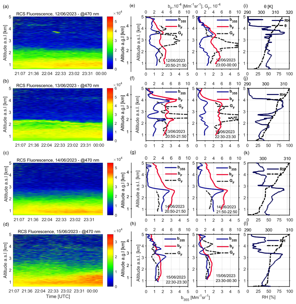 Figure 9a–d present the spatio-temporal evolution of the range-corrected lidar signal (RCS) at the fluorescence channel (470 nm), while Fig. 9e–h present the vertical profiles of b355, bF and GF. The vertical profiles of RH and θ obtained by local radiosondings at 23:00 UTC on the nights 12–15 June 2023, are presented in Fig. 9i–l. The general overview of Fig. 9a–d shows the presence of aerosol fluorescent layers from ground up to 2–2.5 km heigh, which at near ground level (below 1.2–1.5 km) may be influenced mainly by the high concentrations of grass pollen from local sources, as discussed in Fig. 8b, c. The backward trajectory analysis of the air masses arriving over Payerne between 1.5–4.0 km during the nights of 12–15 June indicated as aerosol source region the wildfires occurring in Germany (Fig. S9a, b, c, d).