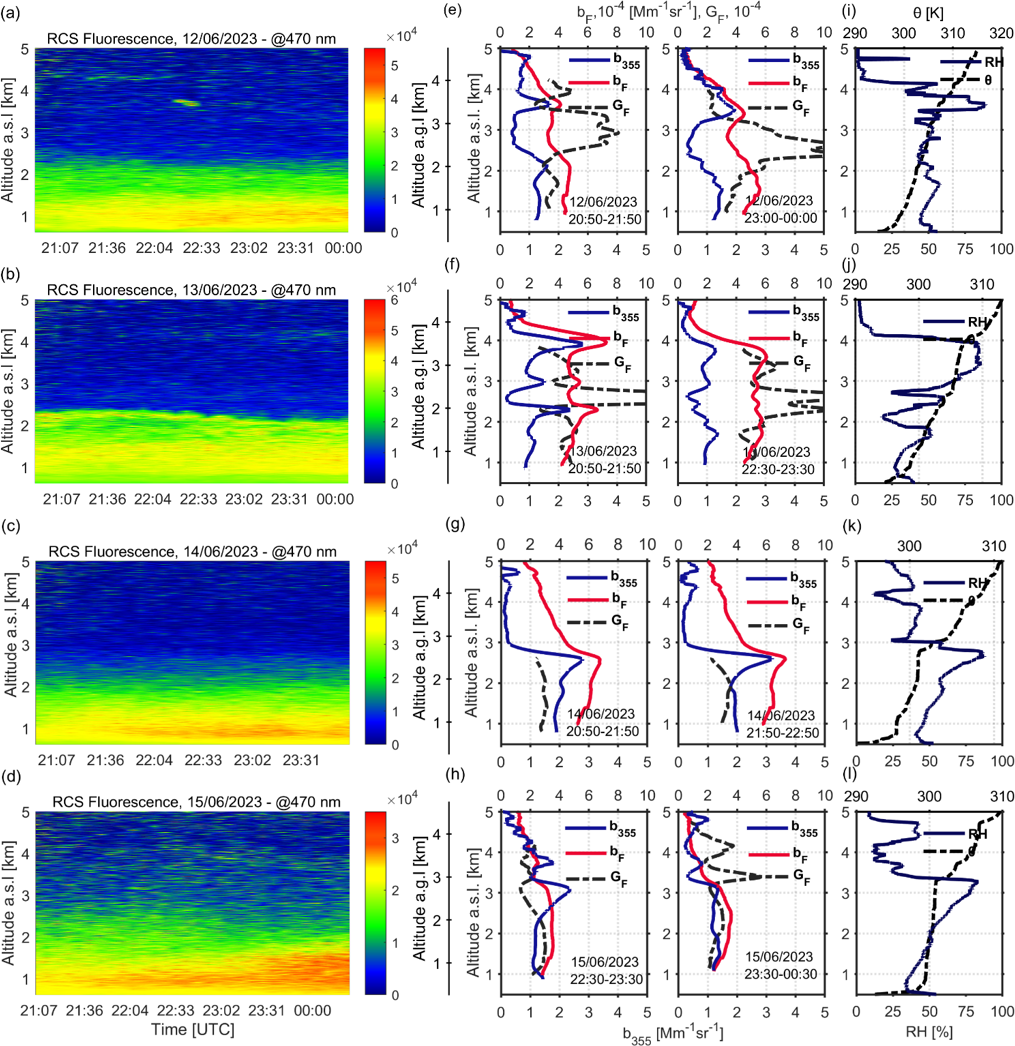 Figure 9(a–d) Spatio-temporal evolution of the range-corrected lidar signal (RCS) at the fluorescence channel (470 nm) (e–h) aerosol b355 and fluorescence bF backscatter coefficients and GF profiles (hourly means, with times indicated in the plots) (i–l) RH and θ as obtained by radiosonde launches around 23:00 UTC for the period 12–15 June 2023.
