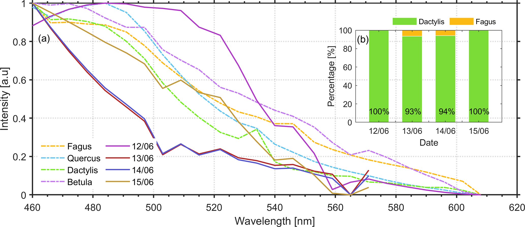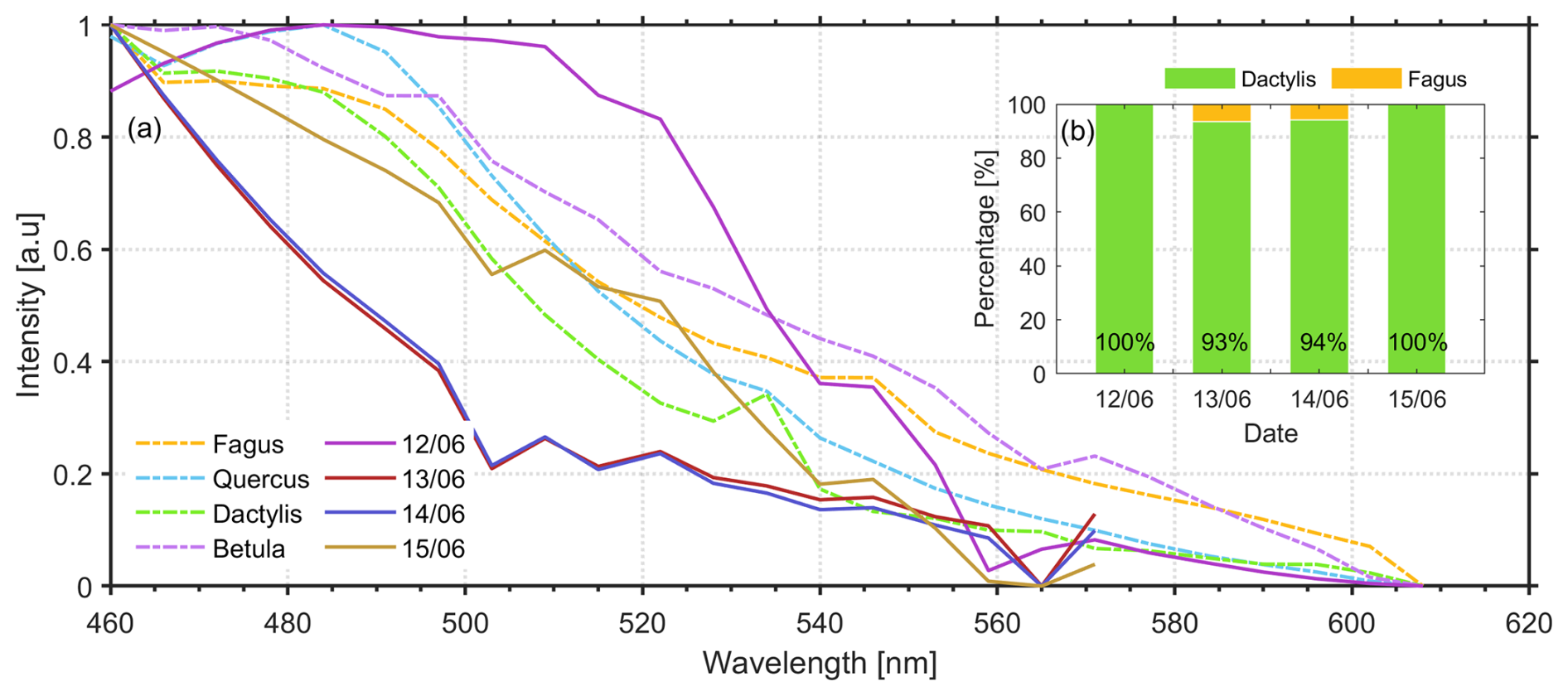 Figure 10a presents the in vivo LIF fluorescence spectra (dashed lines) of four different pollen types Dactylis glomerata, Fagus sylvatica, Betula pendula and Quercus robur obtained by laser excitation at 355 nm under laboratory conditions as explained in the previous case of May 2023. Additionally, in the same figure we present the fluorescence spectra obtained by the lidar multichannel spectrometer from 12 to 15 June, averaged in the height region from ground up to 1.2 km a.s.l. height (continuous lines).