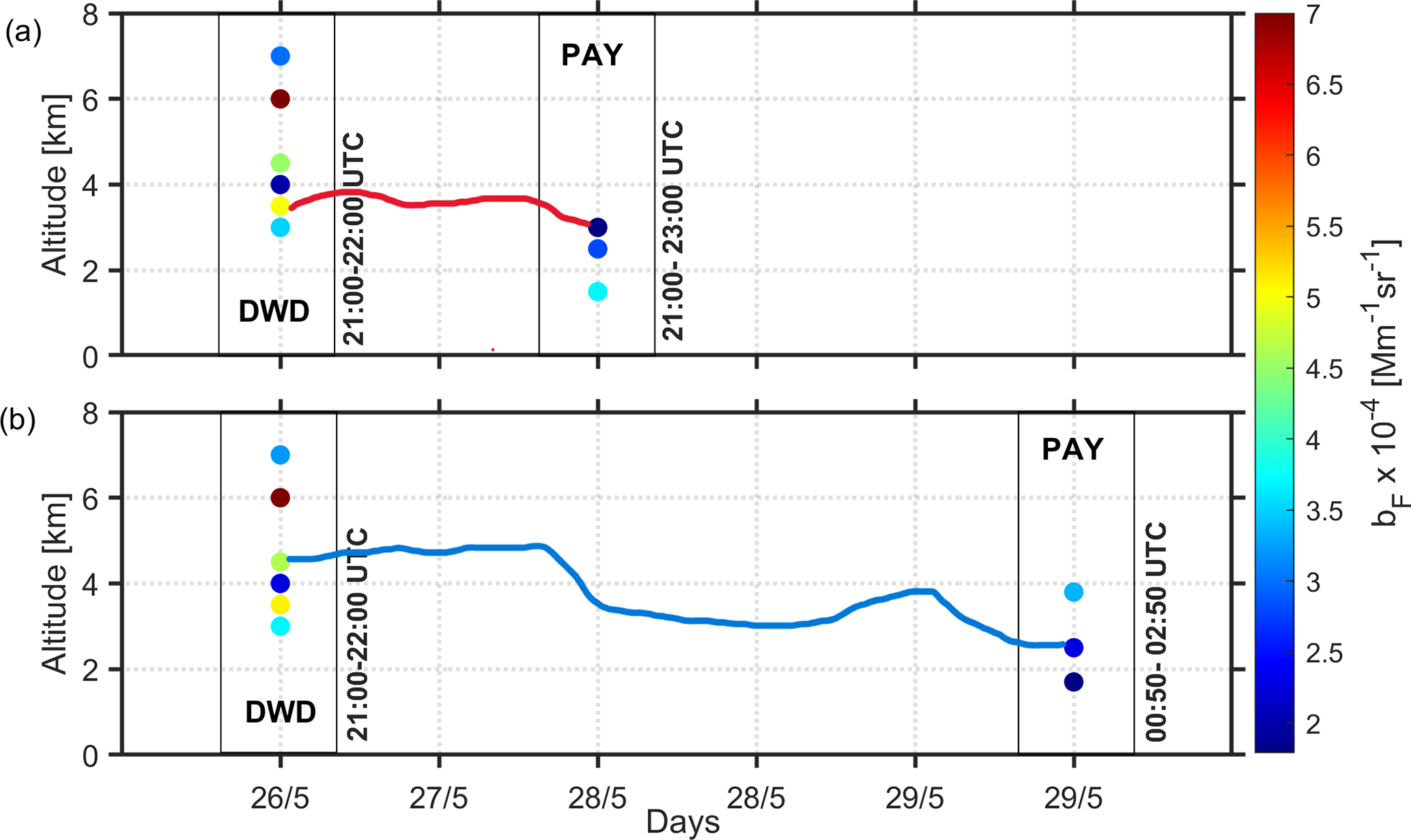 We note in Fig. 6a (27 May) the presence of distinct nearly homogeneous aerosol layers present at the fluorescence channel (yellow and green filaments) from ground up to about 1.85 km a.s.l. height (top of the PBL as derived by local radiosounding data, cf. Fig. 6g), while a thinner aerosol layer was observed between 4.7–4.9 km. Based on the back trajectory analysis of the air masses arriving over Payerne (at 23:00 UTC, as shown in Fig. S1a) we found that the distinct aerosol layer observed around 4.8 km was related to smoke particles released by intensive forest fires in Canada and transported over the Atlantic ocean to Switzerland. The lower yellow-green layer below 1.8 km was confined inside the PBL during the whole night. The fluorescence particles inside the PBL showed an increased fluorescence backscatter (bF7.4×10-4 Mm−1 sr−1) and a well-mixed elastic backscatter coefficient (b3552.2×10-4 Mm−1 sr−1) up to 1.8 km height (Fig. 6d). Indeed, referring to Fig. 5b, c we observed increased values of grass pollen (>100 particles m−3) at ground level during that night, which explains the high values of bF between 22:15 UTC (27 May) and 00:15 UTC (28 May) probably due to mixed bioaerosols (BB and pollen) and moderate fluorescence capacity indicating the presence of fluorescence particles inside the PBL. Between 2–3 km, a thin aerosol layer was identified (Fig. 6a) with moderate b355 (1.6 Mm−1 sr−1) and still strong bF (<5×10-4 Mm−1 sr−1) and increased GF (1.5–3.25 × 10−4) values, confirming again the presence of fluorescent aerosols (Hu et al., 2022; Veselovskii et al., 2022a). Within this layer, the RH increases with height (from 63 % to over 85 %), while θ shows a slight increase (300 to 303 K), indicating the presence of a stable layer (cf. Fig. 6g). The thin aerosol layer around 4.5 km (Fig. 6d) exhibited increased elastic backscatter (b355∼1.9 Mm−1 sr−1) but with a lower fluorescence backscatter (bF1.4×10-4 Mm−1 sr−1) coefficient, indicating fewer fluorescence aerosols due to long-range transport of dried BB aerosols (Reichardt et al., 2025), as the RH decreased down to  8 %.