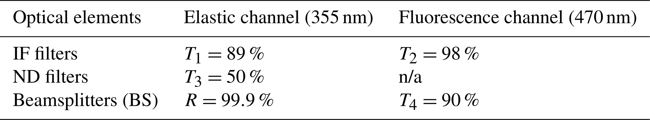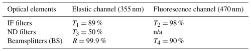 Table 1Transmission and reflectance of the optical elements of the LIF spectrometer at 355 and 470 nm channels.
