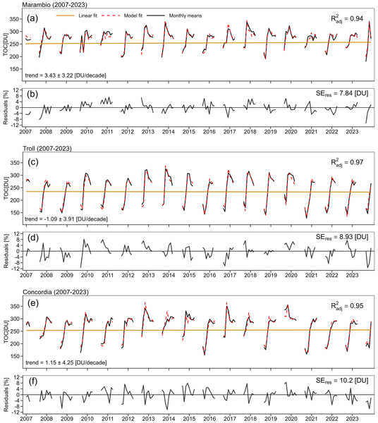 Evaluation of factors affecting total ozone column and its trend at three Antarctic stations in the years 2007–2023