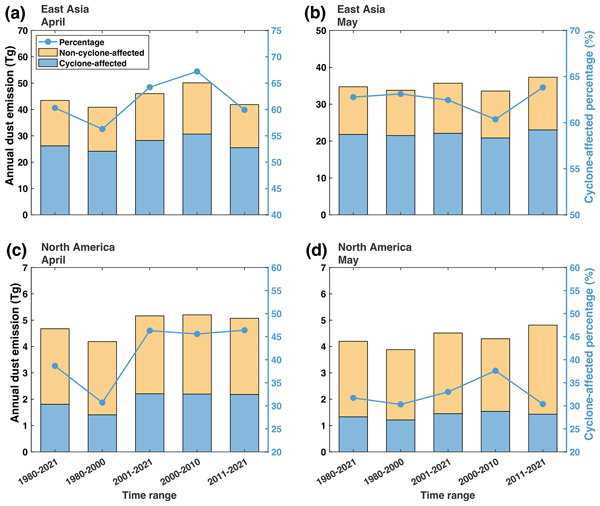 Attributing the decadal variations in springtime East Asian and North American dust emission to regime shifts in extratropical cyclone